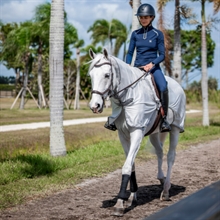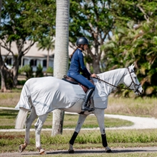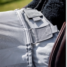 Deze lichte vliegendeken om mee te rijden is ontworpen om rondom het zadel te liggen zonder de beenhulpen van de ruiter te beïnvloeden. De deken beschermt het paard van rug tot staart met een ademend materiaal met UV-bescherming, dat helpt om vliegen en andere insecten op afstand te houden.