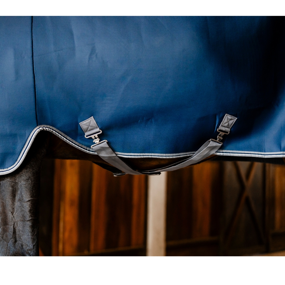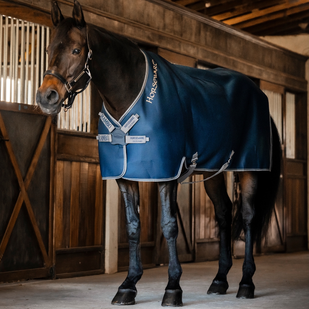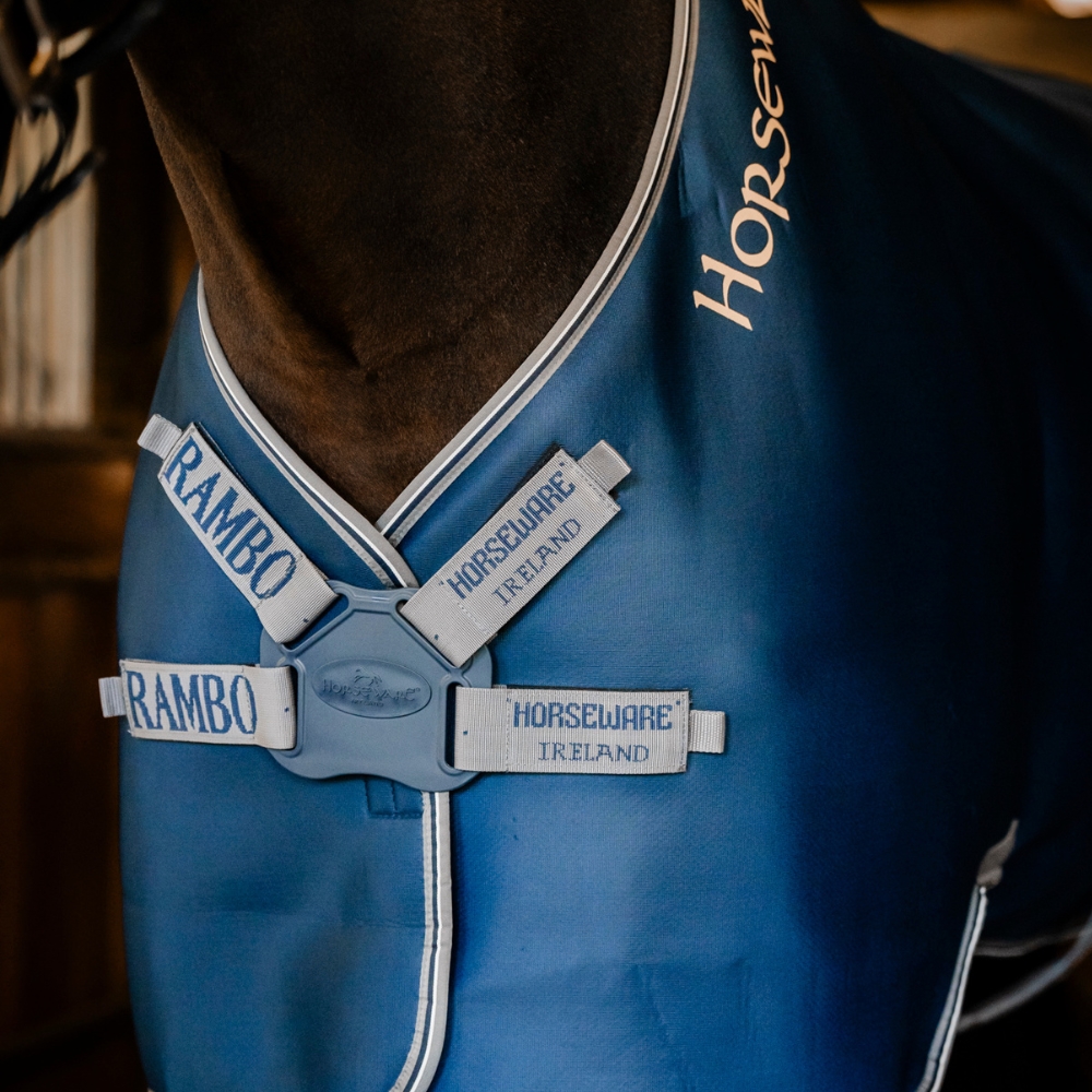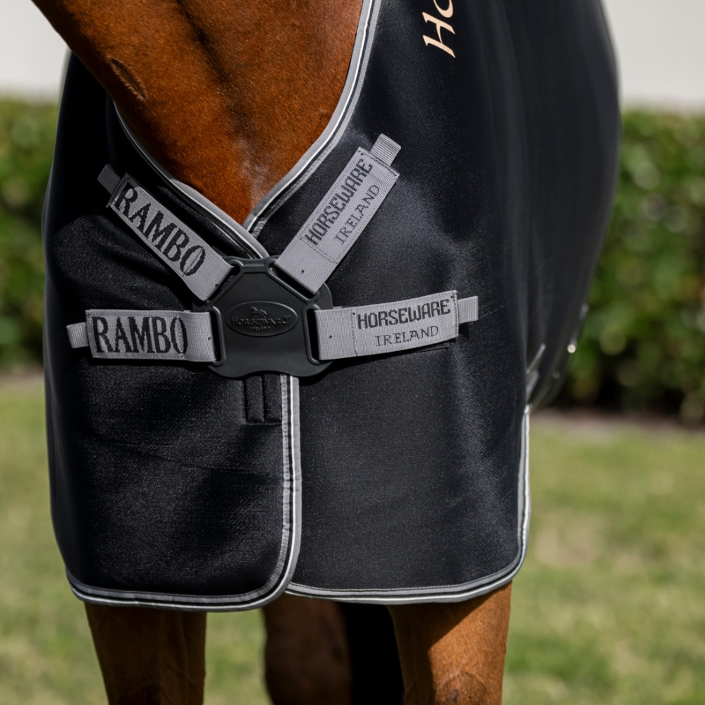 Rambo Airmax cooler deken met Disc voorsluiting. De deken is een polyester netdeken die is gemaakt in 3D-structuur, de deken helpt om het paard warm te houden op koude dagen en op warme dagen helpt het om oververhitting van het paard te voorkomen. De binnenkant van de deken is zacht en zweetabsorberend, wat ervoor zorgt dat het vocht van het lichaam van het paard naar de buitenkant van de deken wordt getransporteerd. De buitenkant van de deken is glad, zodat strooisel niet blijft hangen. De deken is ademend, heeft kruissingels en een staartriem.