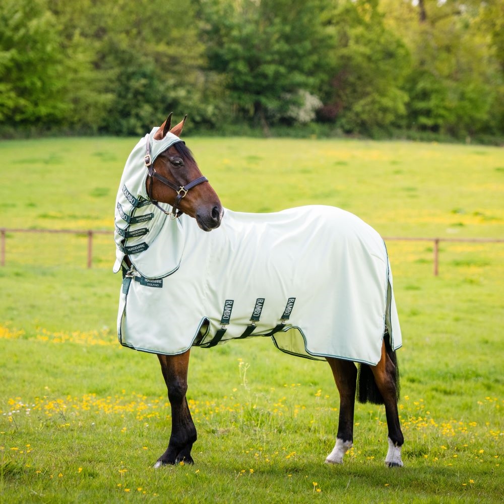 De buitenkant is gemaakt van sterk 1000 Denier polyester, wat zorgt voor een lange levensduur. De deken heeft een vaste hals die helemaal tot rond de oren doorloopt, evenals een grote buikflap en een extra lange staartflap voor maximale bescherming tegen insecten. De gladde voering aan de voorkant en over de manen helpt de vacht van het paard te beschermen tegen schuren.