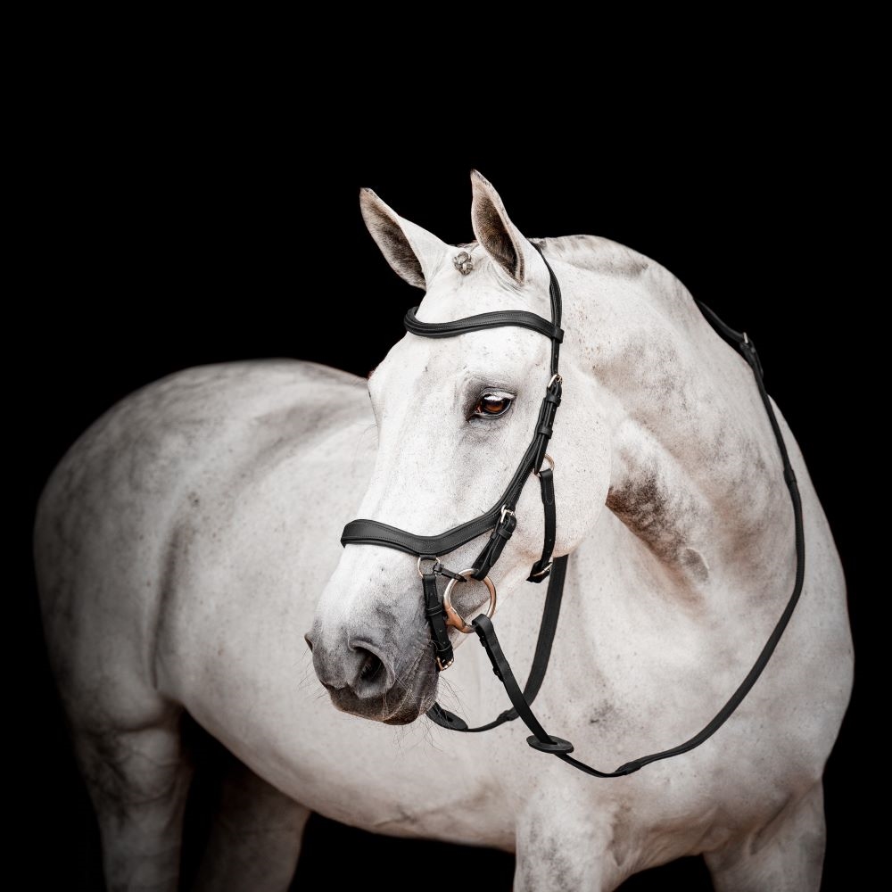 Er wordt een gesp meegeleverd die van het hoofdstel naar het bit kan worden geklikt, wat stabiliteit creëert en het bit optilt zodat het minder druk op de tong legt.