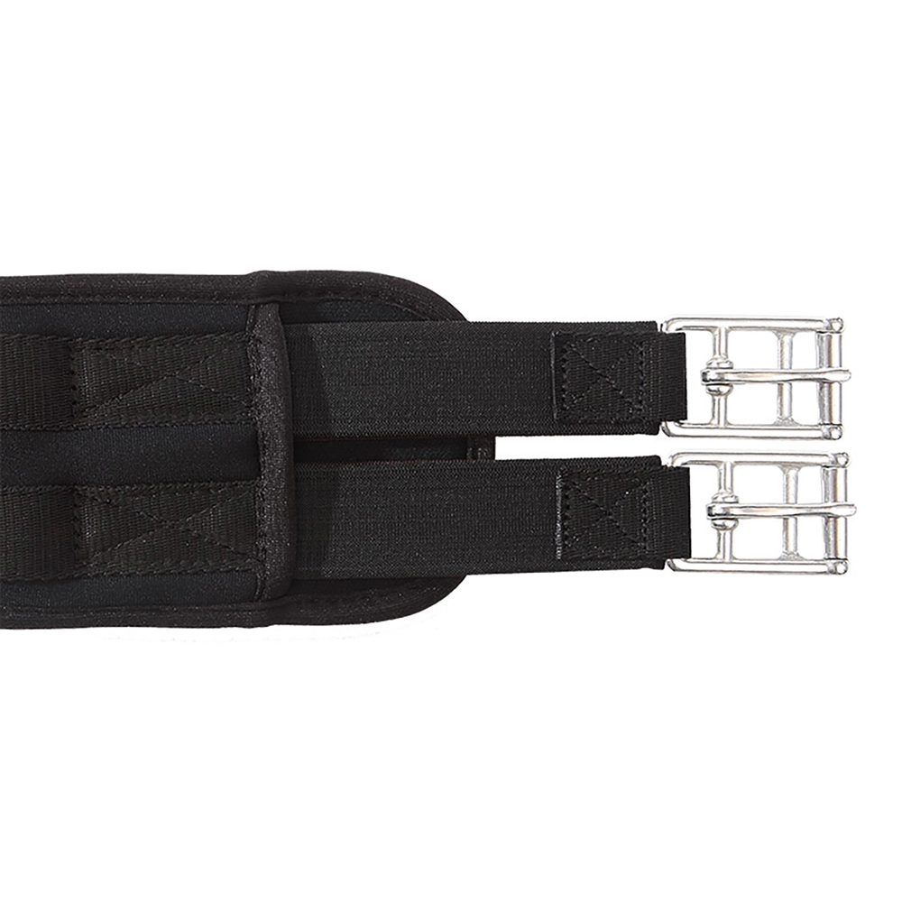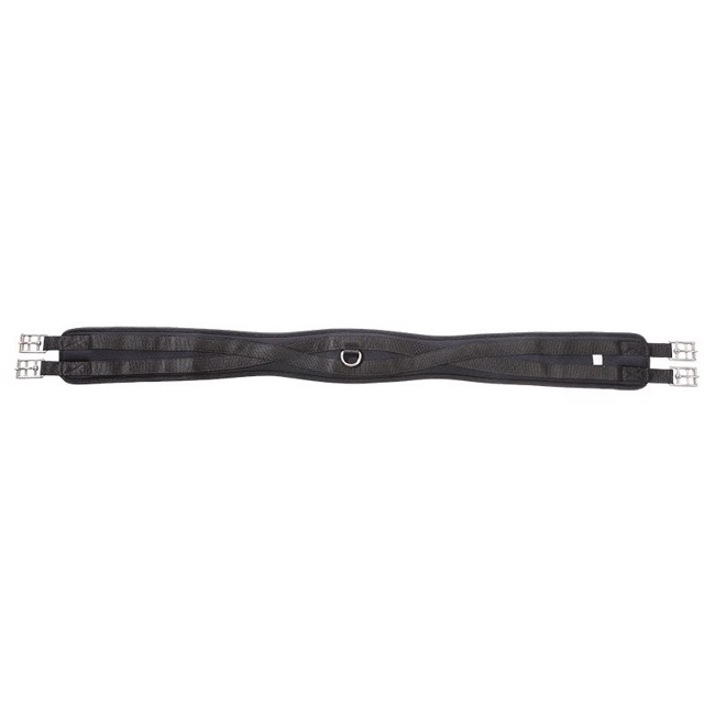 De singel is uitgerust met sterk elastiek aan één kant, wat flexibiliteit biedt en het correct aansingelen vergemakkelijkt. In het midden bevindt zich een praktische D-ring, geschikt voor het bevestigen van hulpteugels.