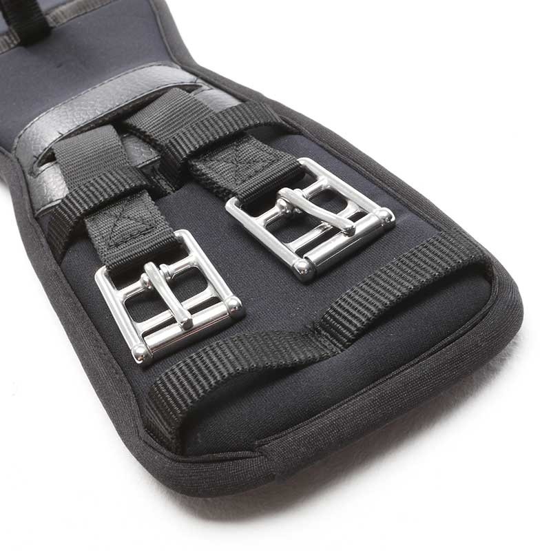 De singel heeft een 14 cm breed drukverlagend middenstuk met D-ring. Roestvrijstalen rolgespen.