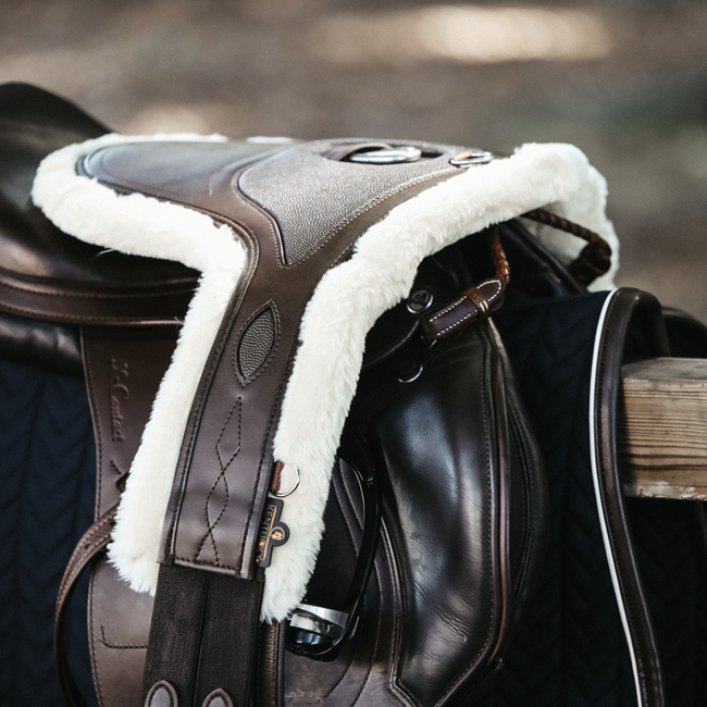 De singel is gemaakt van kunstleer en lam, waarbij het lam druk helpt verminderen en ideaal is voor gevoelige paarden. Het lam kan bovendien worden verwijderd en in de wasmachine worden gewassen op 30°.