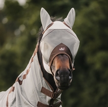 Vliegenmasker met oren dat de ogen en oren van het paard beschermt tegen insecten. Het masker biedt 100% UV-bescherming en is gemaakt van mesh, terwijl de oren zijn gemaakt van gebreid mesh dat sterk is. Het masker wordt gesloten met twee klittenbandriemen onder de kaak en kan in de machine worden gewassen op 30 graden. Het wordt aanbevolen om het zo min mogelijk en zo voorzichtig mogelijk te wassen en waszakken te gebruiken om de kwaliteit van het masker op lange termijn te behouden. Het wordt aanbevolen om het masker te laten drogen aan de lucht.