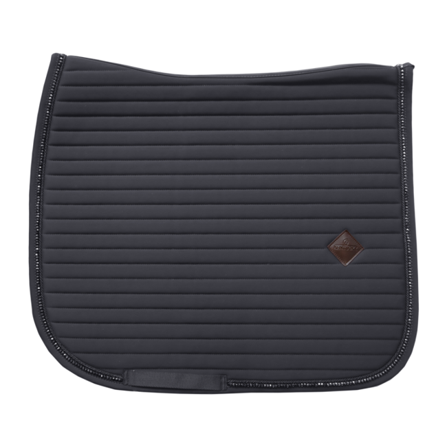 Naast de prachtige parelpiping is er een mooi, discreet leren logo. Het zadelonderlegger heeft geen zadelriemen, alleen singelriemen, en daarom geeft het een eenvoudige en mooie uitstraling.