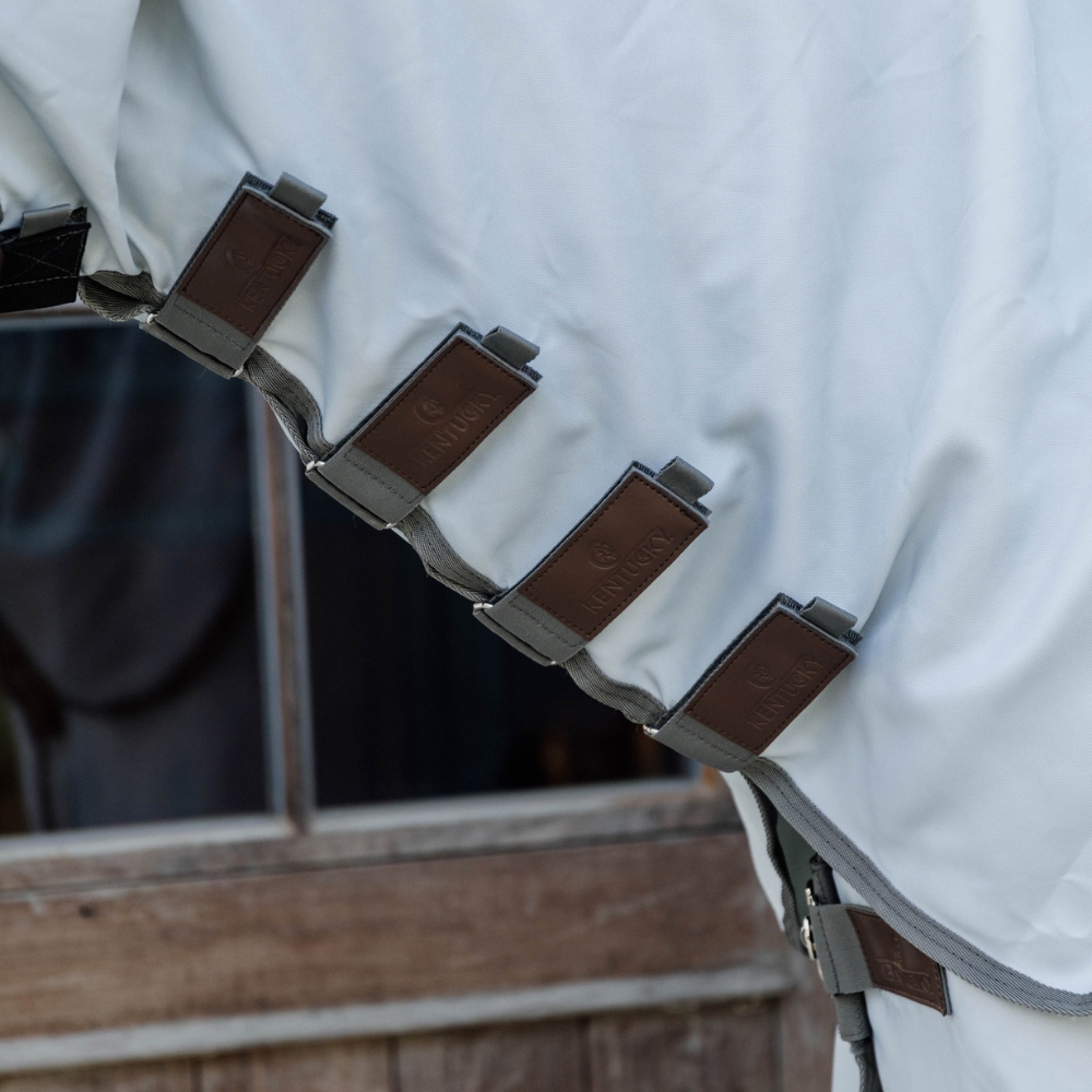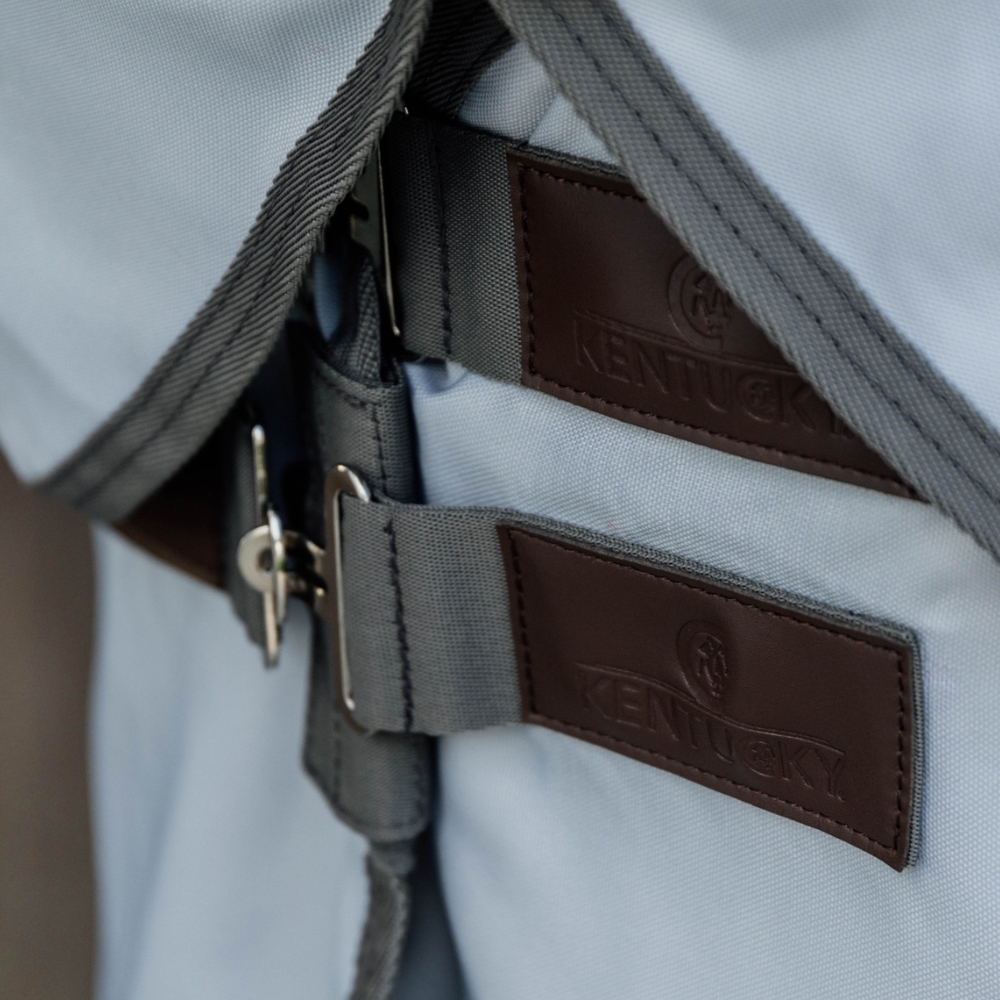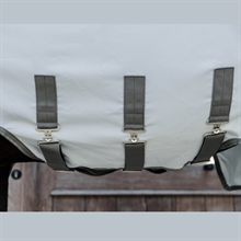 Deze deken heeft een extra lange hals, die over de oren is bevestigd – dit betekent dat de hals van je paard ook volledig beschermd is. De hals wordt gesloten met 5 klittenbandsluitingen.