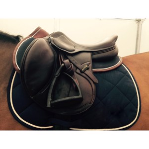 Zwart met witte piping en bruine lederen rand