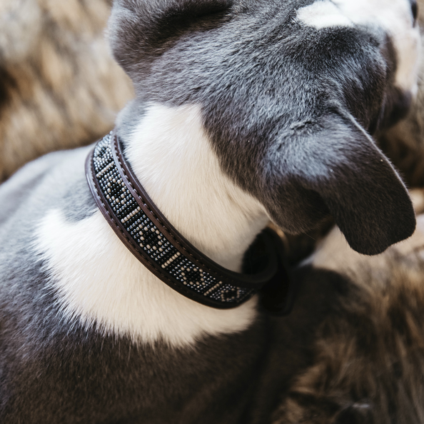 De halsband heeft een stevige ring voor het bevestigen van de lijn, waardoor hij zowel mooi als functioneel is. Perfect voor dagelijks gebruik, wandelingen en evenementen waar je hond er op zijn best uit moet zien.