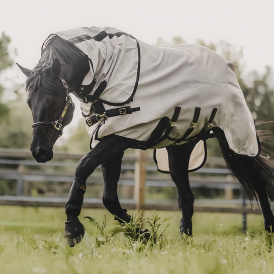 Het deken is gemaakt van een lichte stof en geweven in een mesh patroon, dat de meeste insecten weghoudt. De stof is ongelooflijk sterk en plat geweven aan de binnenkant, zodat het voorkomen wordt dat de haren van het paard vast komen te zitten in het deken. Het deken is gemaakt in een lichte beige kleur, waardoor de zon wordt gereflecteerd en het paard het niet te warm krijgt. Het stuk bij de manen, voorkant en staart is gevoerd met een glad stuk polyester om slijtage te voorkomen.
