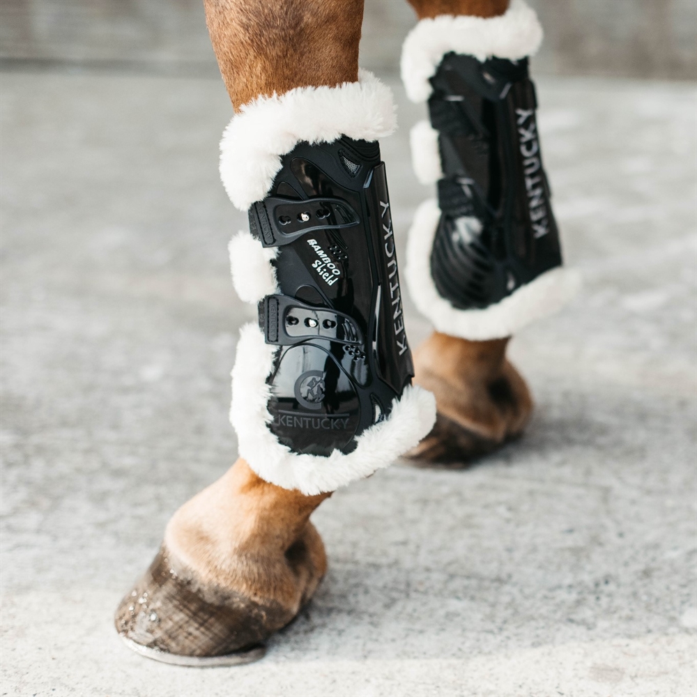 Kentucky voorbeenbeschermers Bamboo Elastic zijn springbeschermers in een nieuw innovatief design, omdat de beschermers zijn gemaakt met focus op duurzaamheid. De beschermers zijn gemaakt van een sterke TPU-schaal met meerdere ventilatiegaten bij het peesgebied en er is ook mesh-ventilatie. De TPU-schaal is versterkt rond het peesgebied met een bamboeschild om stoten en verwondingen te voorkomen. Waar het paard zijn been buigt, is er een zacht natuurrubberstuk toegevoegd om wrijving te voorkomen. Het binnenste deel van de beschermers is versterkt met een extra laag TPU. Zo bereik je een optimale bescherming van de benen van het paard. De beschermers zijn voorzien van veganistisch schapenvacht aan de binnenkant. Kentucky is zeer gefocust op duurzaamheid en dierenwelzijn. Hier hebben ze ervoor gekozen om bamboe te gebruiken als een nieuwe groene technologie die iedereen kent. Bamboe is de snelst groeiende plant ter wereld, heeft een enorme treksterkte en voorkomt het binnendringen van scherpe voorwerpen en is antibacterieel. Dankzij het anatomisch gevormde design zitten de beschermers goed rond de benen van het paard en bieden ze maximaal comfort en bescherming. De zachte en flexibele rubberen inzet onder het gewricht geeft het paard ook een verbeterde bewegingsvrijheid. De beschermers zijn bovendien Rico-test goedgekeurd en RCT-gecertificeerd. Verkrijgbaar in de kleuren: Black - Brown - Emerald - Old rose Verkrijgbaar in maten: XS - S - M - L
