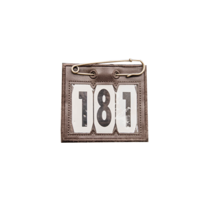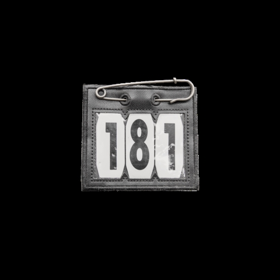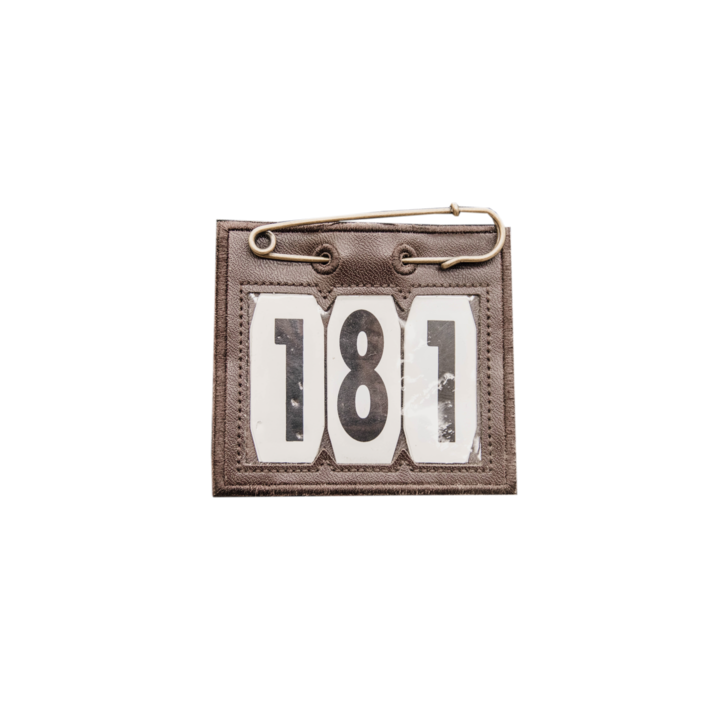 Wedstrijdnummer in kunstleer met grote veiligheidsspeld van Kentucky.