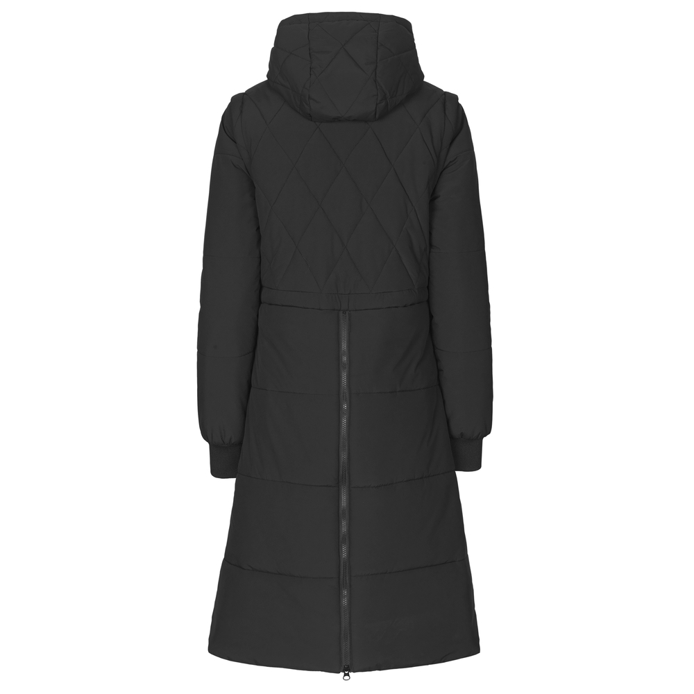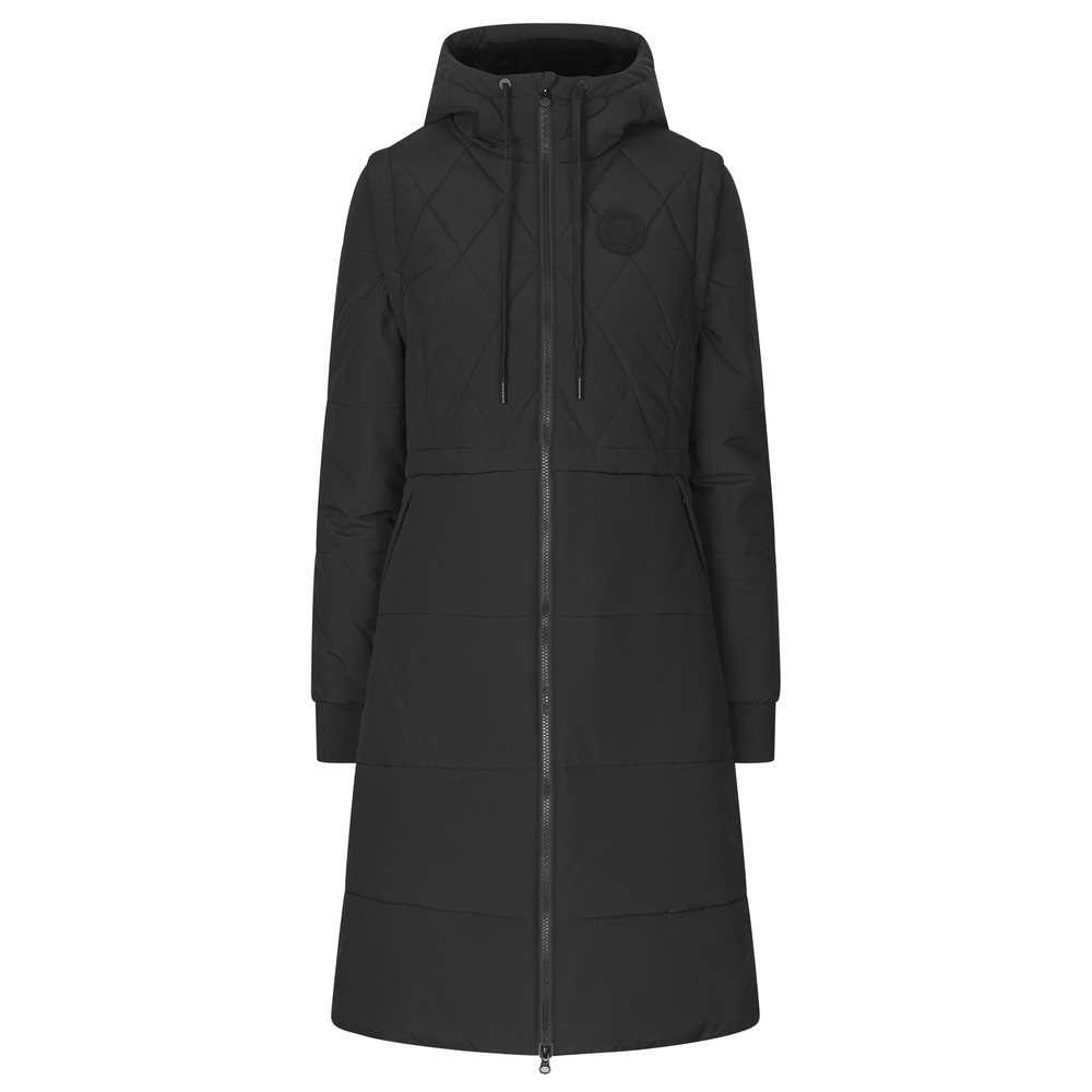 De jas kan eenvoudig worden omgevormd tot een elegante, lange rijbodywarmer door de mouwen af te ritsen – een praktische en stijlvolle oplossing in één en hetzelfde kledingstuk.