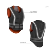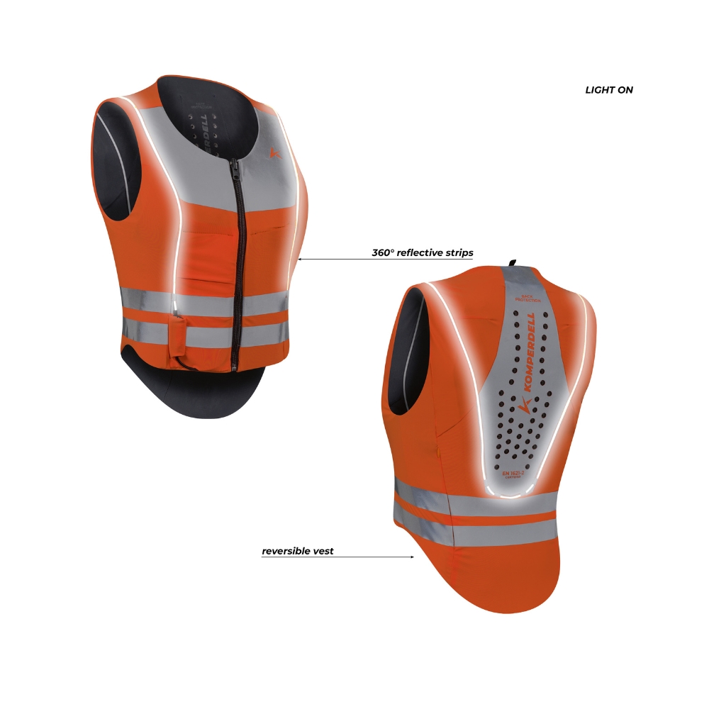 De lichte en flexibele constructie zorgt voor maximale bewegingsvrijheid, terwijl zijbeschermingszones de veiligheid verder verhogen. Het vest is omkeerbaar en kan worden gedragen in zwart of feloranje. Reflectiestrepen en actieve LED-verlichting zorgen voor extra zichtbaarheid bij mist, schemering of in het donker.