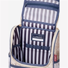 Binnenin het stijlvolle, gestreepte interieur vind je riemen en vakken om al je spulletjes te organiseren.