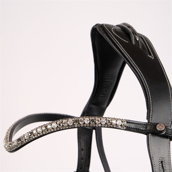 De frontriem wordt aan het hoofdstel bevestigd met een drukknoop.