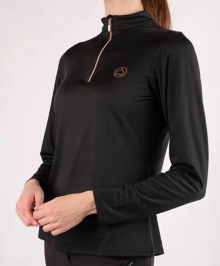 Heerlijk lang mouw trainingsshirt van Montar met prachtige rosegold details. Het shirt is gemaakt van Montars Mon-Tech stof dat uiterst rekbaar, ademend en zweetabsorberend is. Mon-Tech is speciaal ontwikkeld voor sportgebruik en heeft een fantastische pasvorm. Het shirt heeft een lage opstaande kraag. Aan de voorkant is er een rosegold rits en aan de linkerkant is er een Montar kristal logo van ongeveer 4 cm in de kleur rosegold.