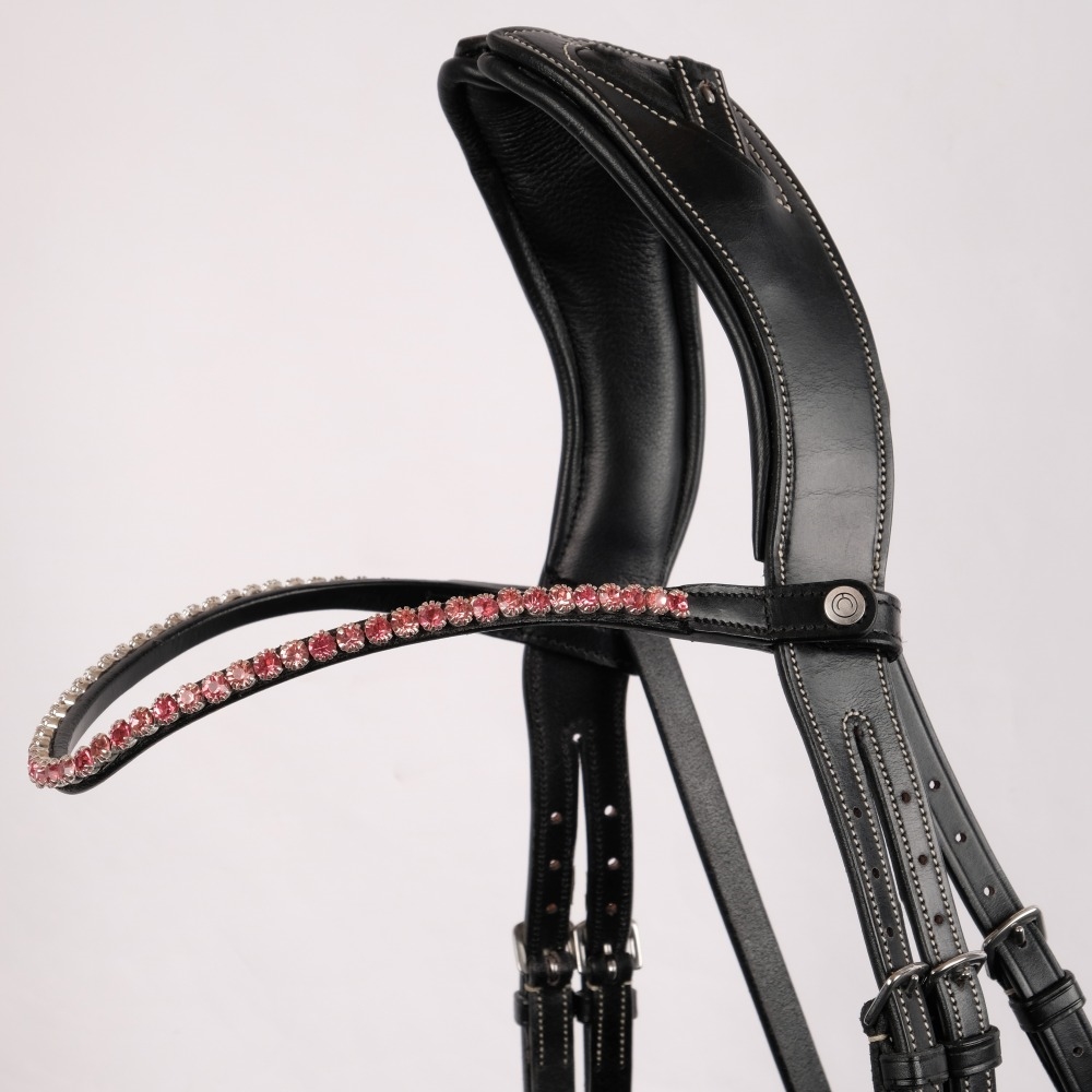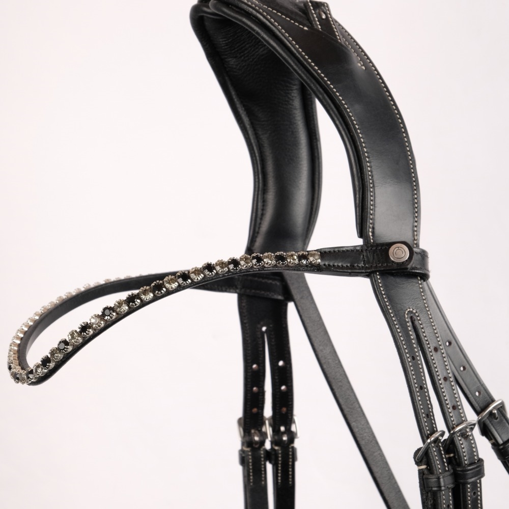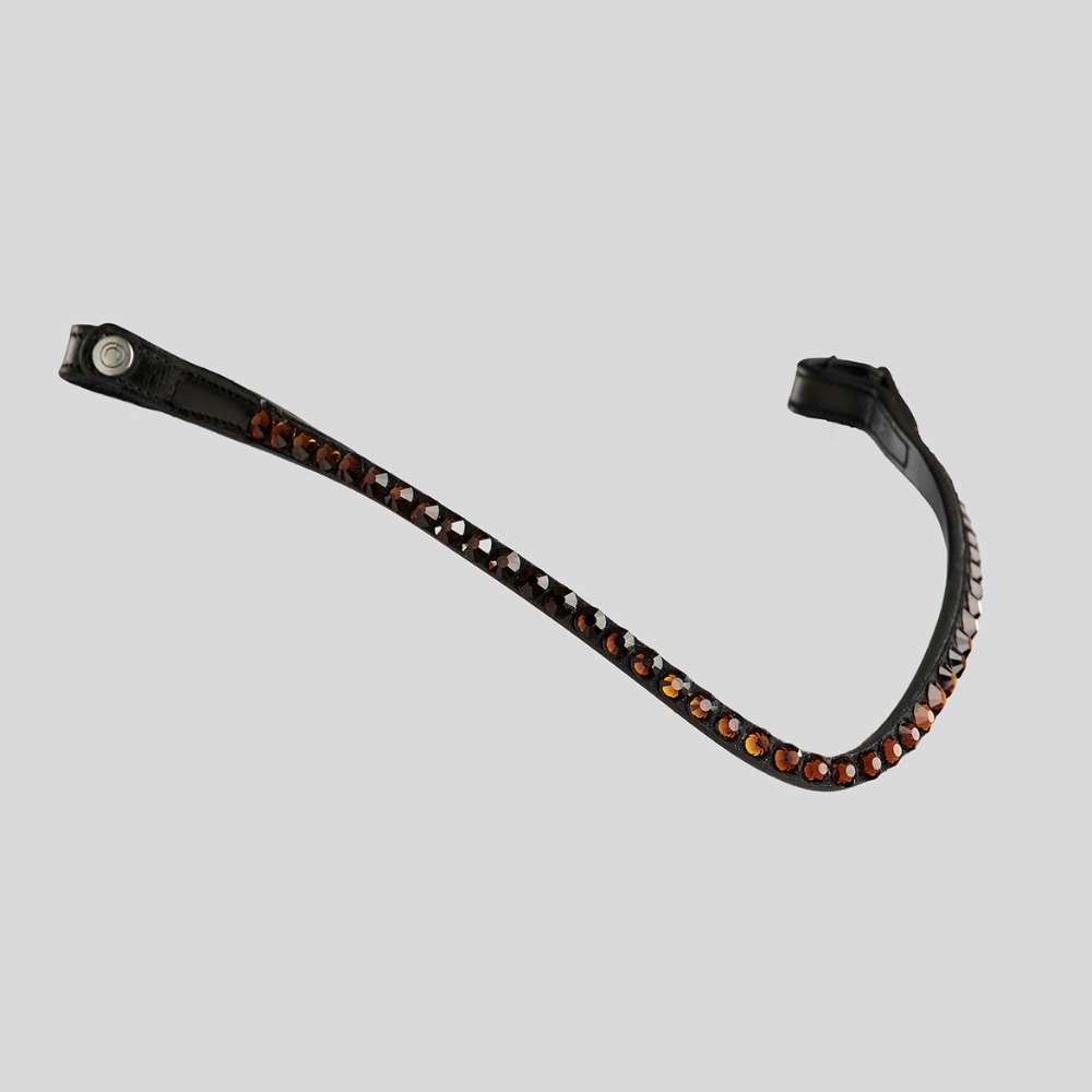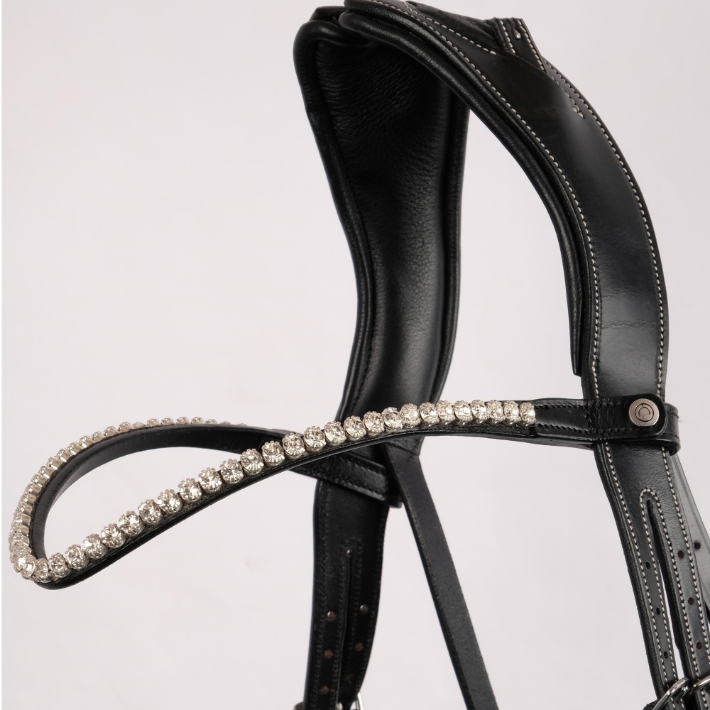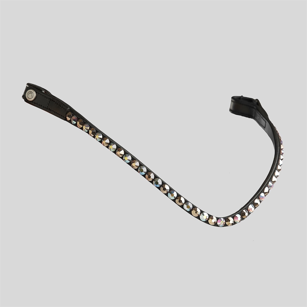 Mooie leren frontriem van Montar met schitterende glinsterende stenen. De frontriem is licht gebogen en heeft drukknopen aan de zijkanten.