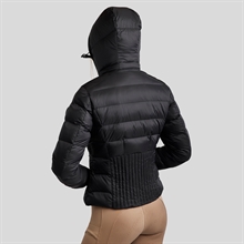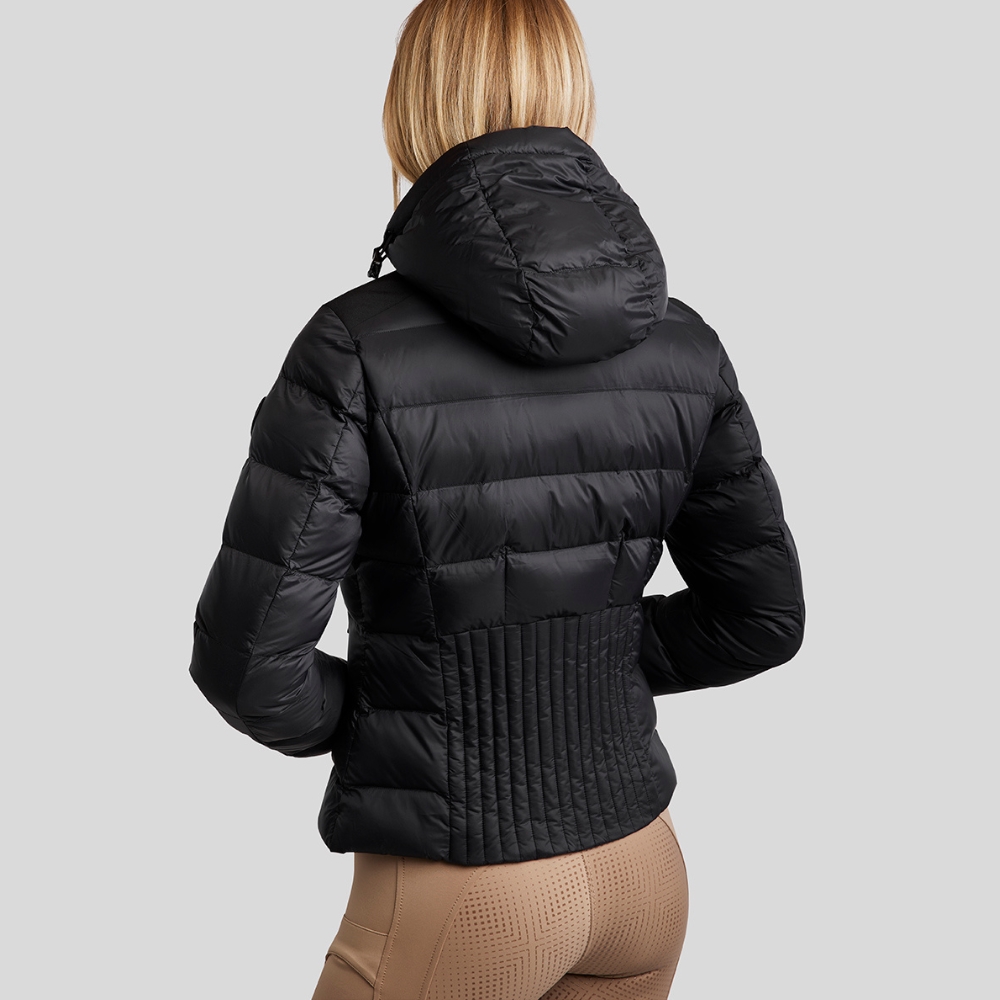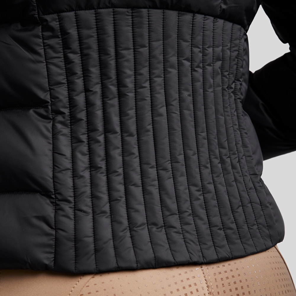 De jas heeft een getailleerde pasvorm, met een gewatteerde rug en waterafstotende voorkant met softshell-schouder.