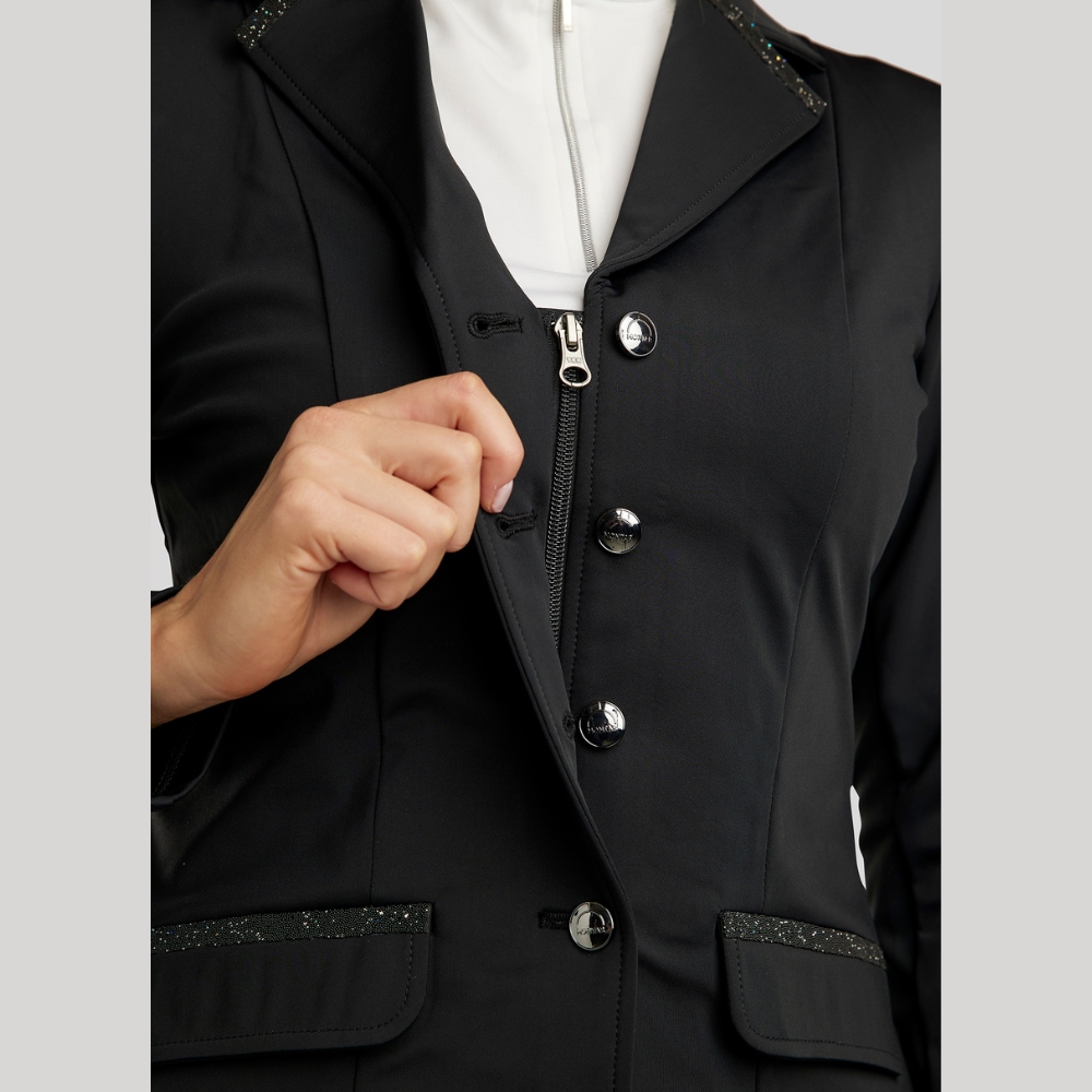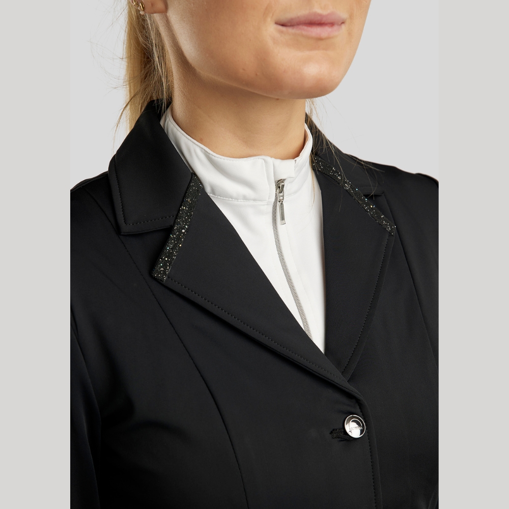 Montar MoAvina is een wedstrijdjas die de wedstrijdgarderobe naar een geheel nieuw niveau tilt, zowel met knopen en een verborgen rits als met zijn prachtige kaviaar kristal details op de zakken en kraag.