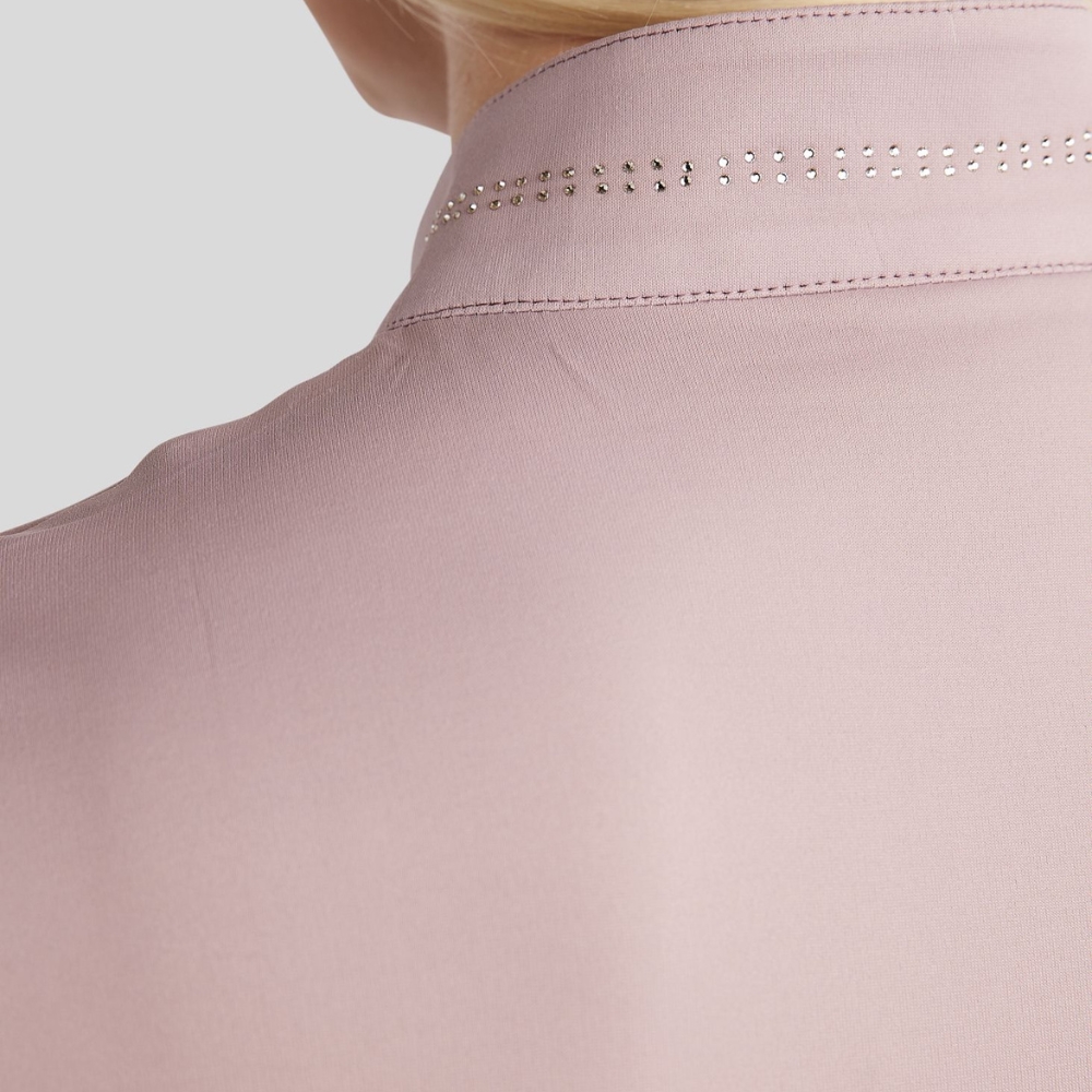 De polo heeft een klassieke en luxe uitstraling met twee rijen champagnekleurige kristallen die prachtig rondom de kraag lopen. Op de borst vind je een subtiel, rond Montar-logo in bijpassende kristallen, wat de elegante look compleet maakt.