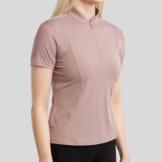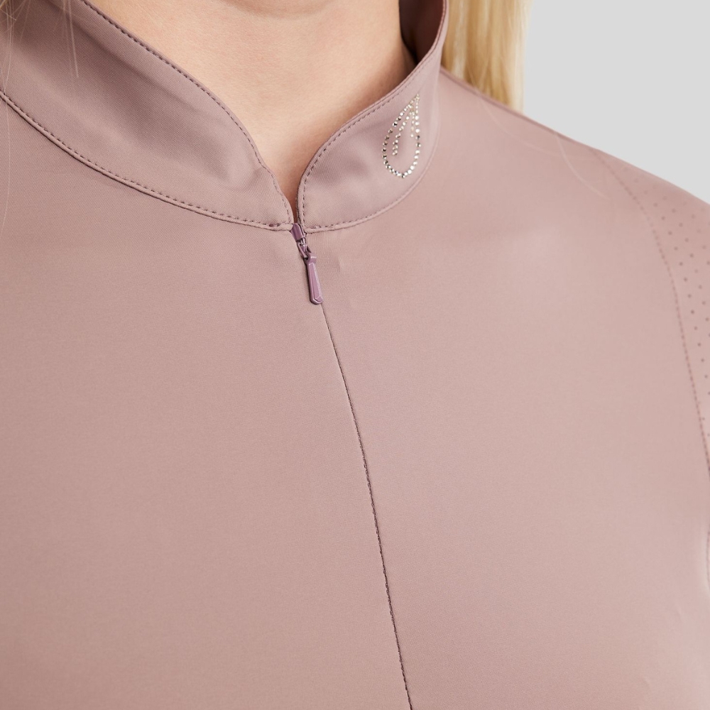 De polo heeft een elegante en tijdloze uitstraling met een prachtig champagnekleurig kristallogo in de kraag, wat zorgt voor een vrouwelijke en luxe look. De mooie lasercut-details langs de zijkanten geven een moderne touch en zorgen tegelijkertijd voor goede ventilatie.