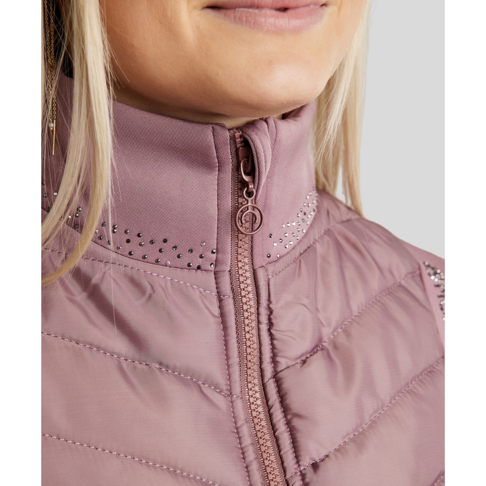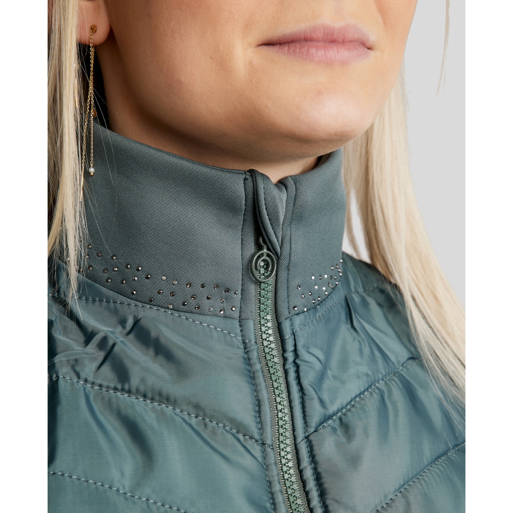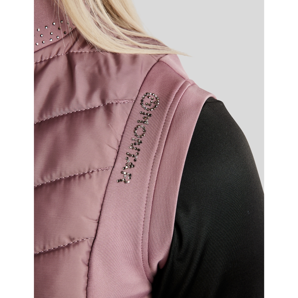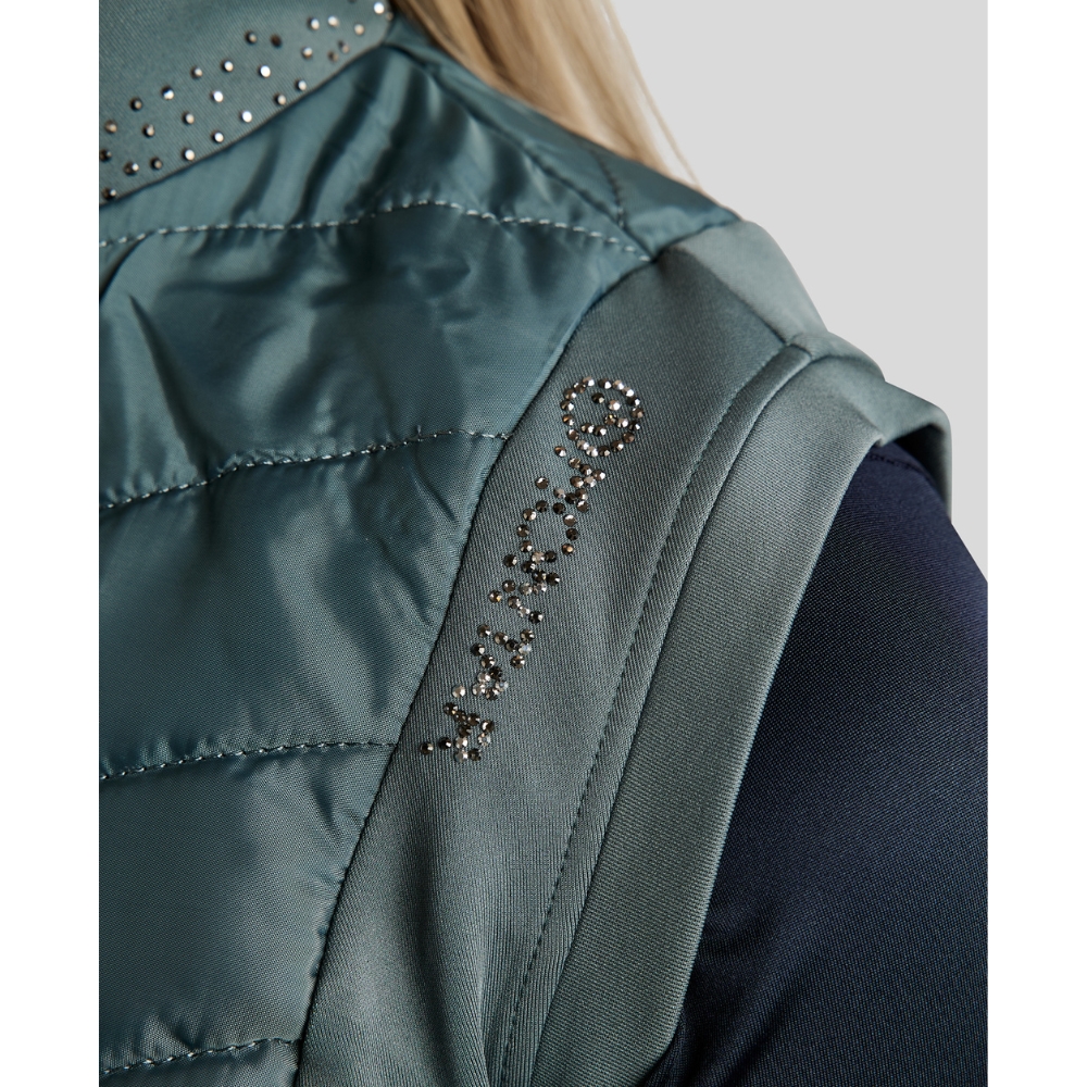 De bodywarmer is ontworpen met flatterende gewatteerde panelen aan de voor- en achterkant, die zowel warmte als structuur toevoegen. De zijpanelen zijn gemaakt van zachte en flexibele softshell, die optimale comfort en bewegingsvrijheid biedt – perfect wanneer je actief bent in het zadel of onderweg. De kraag is versierd met een elegante mix van grijstinten kristallen, en op één schouder staat "Montar" geschreven met hetzelfde type fonkelende kristallen voor een opvallende, vrouwelijke uitstraling.