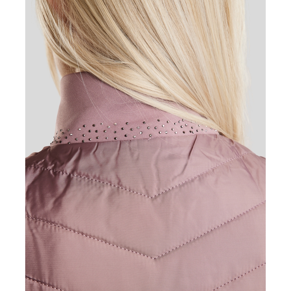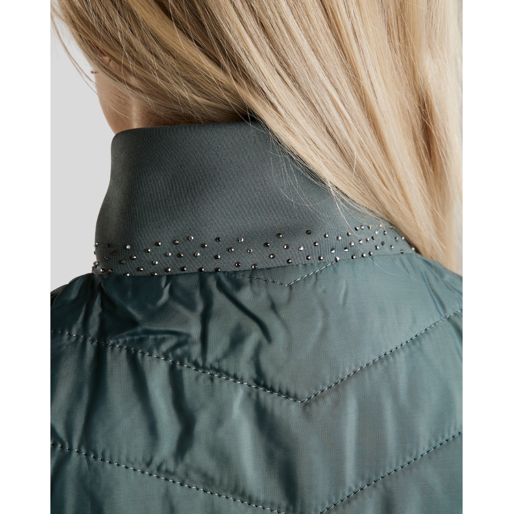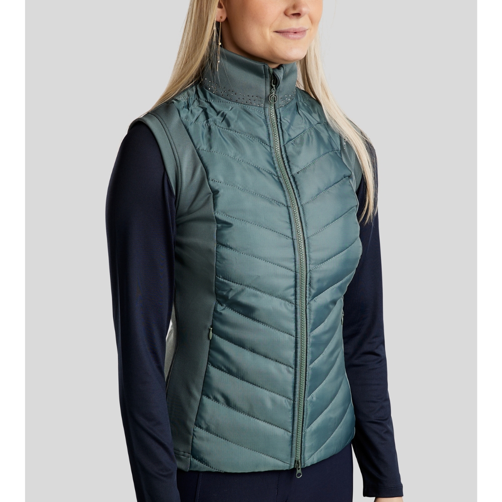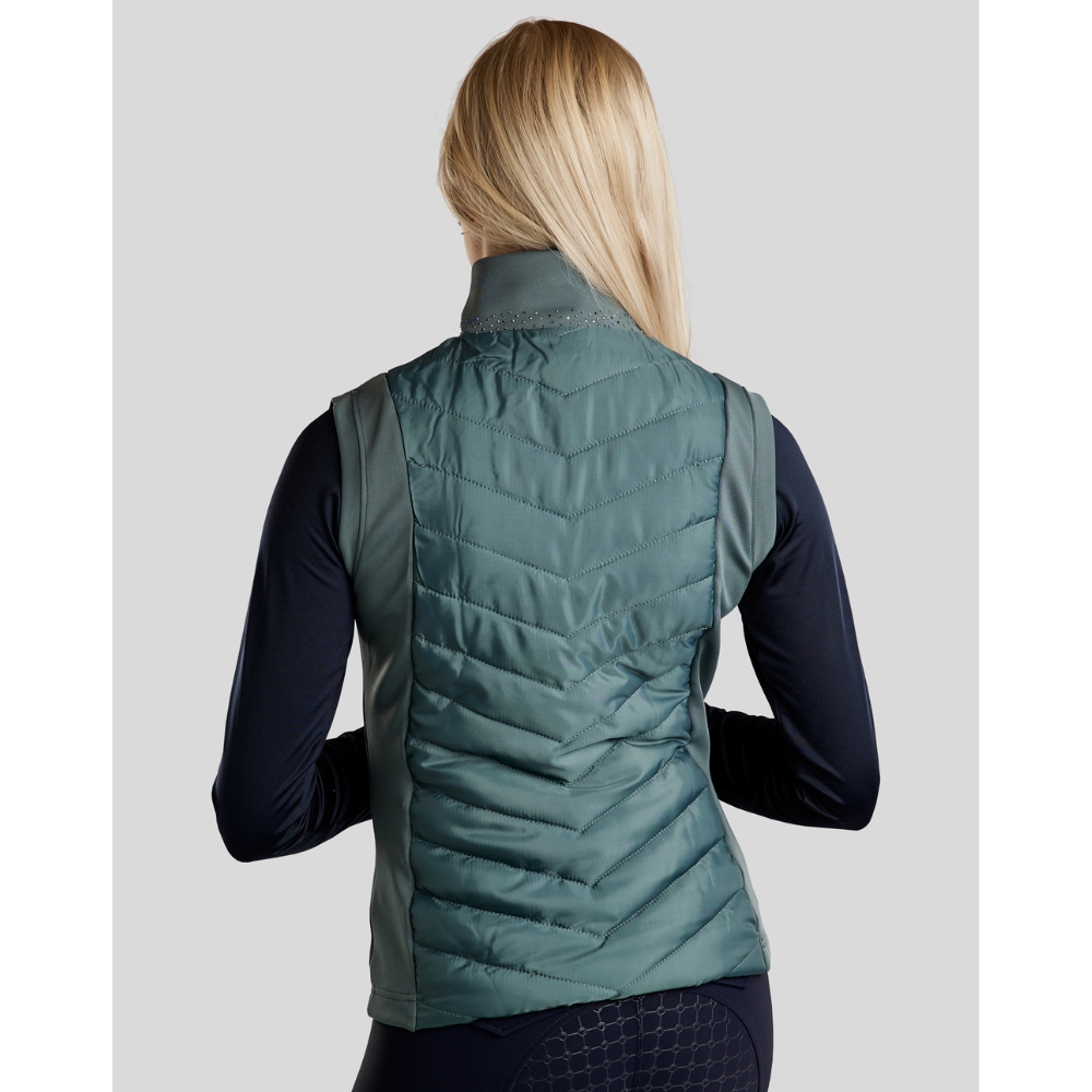 De bodywarmer is ontworpen met flatterende gewatteerde panelen aan de voor- en achterkant, die zowel warmte als structuur toevoegen. De zijpanelen zijn gemaakt van zachte en flexibele softshell, die optimale comfort en bewegingsvrijheid biedt – perfect wanneer je actief bent in het zadel of onderweg. De kraag is versierd met een elegante mix van grijstinten kristallen, en op één schouder staat "Montar" geschreven met hetzelfde type fonkelende kristallen voor een opvallende, vrouwelijke uitstraling.