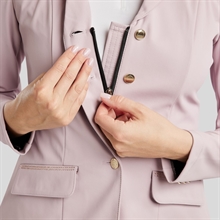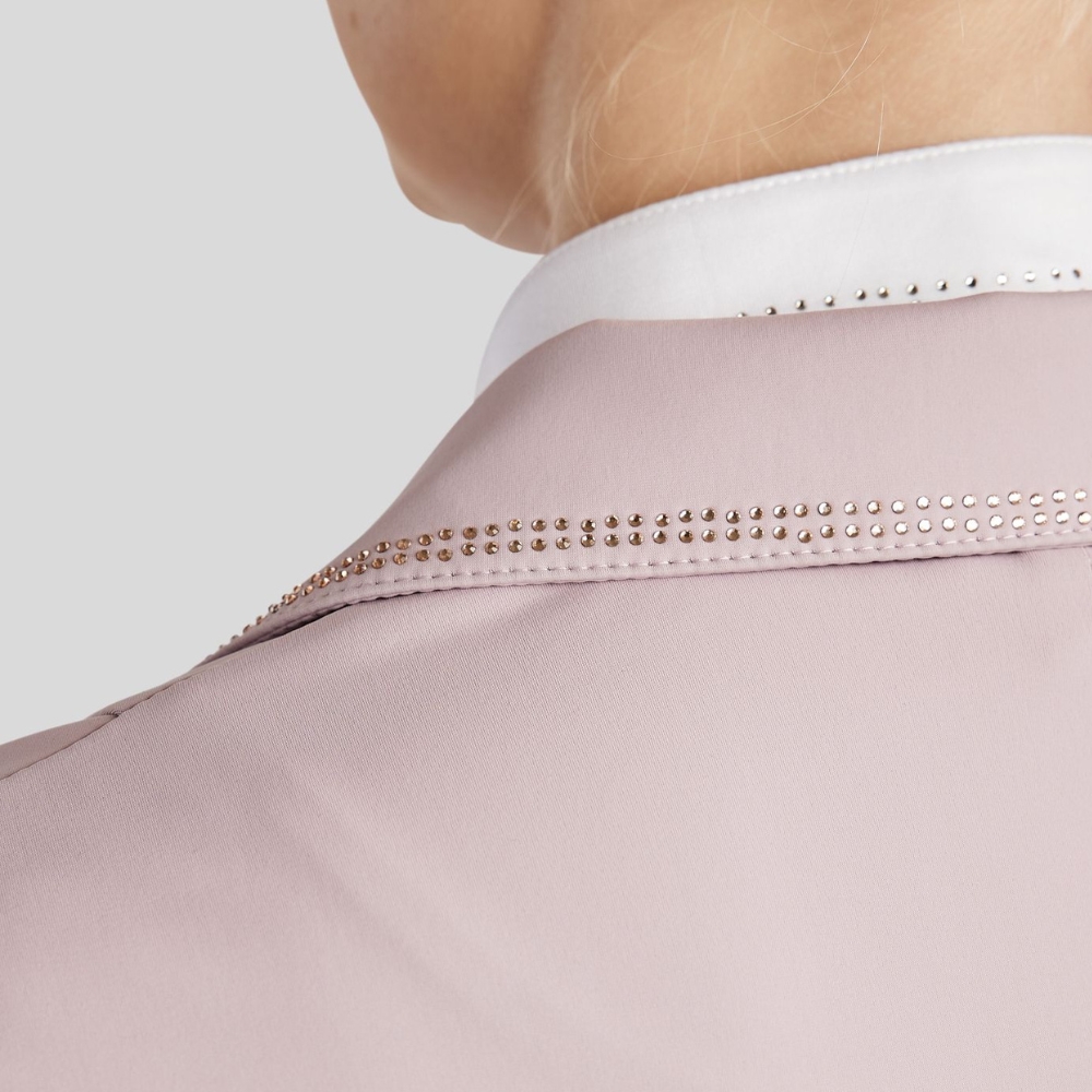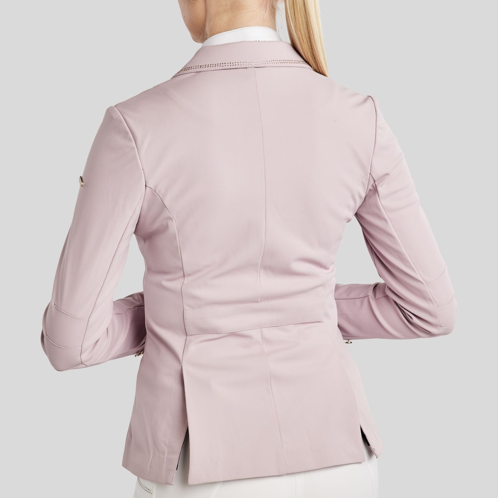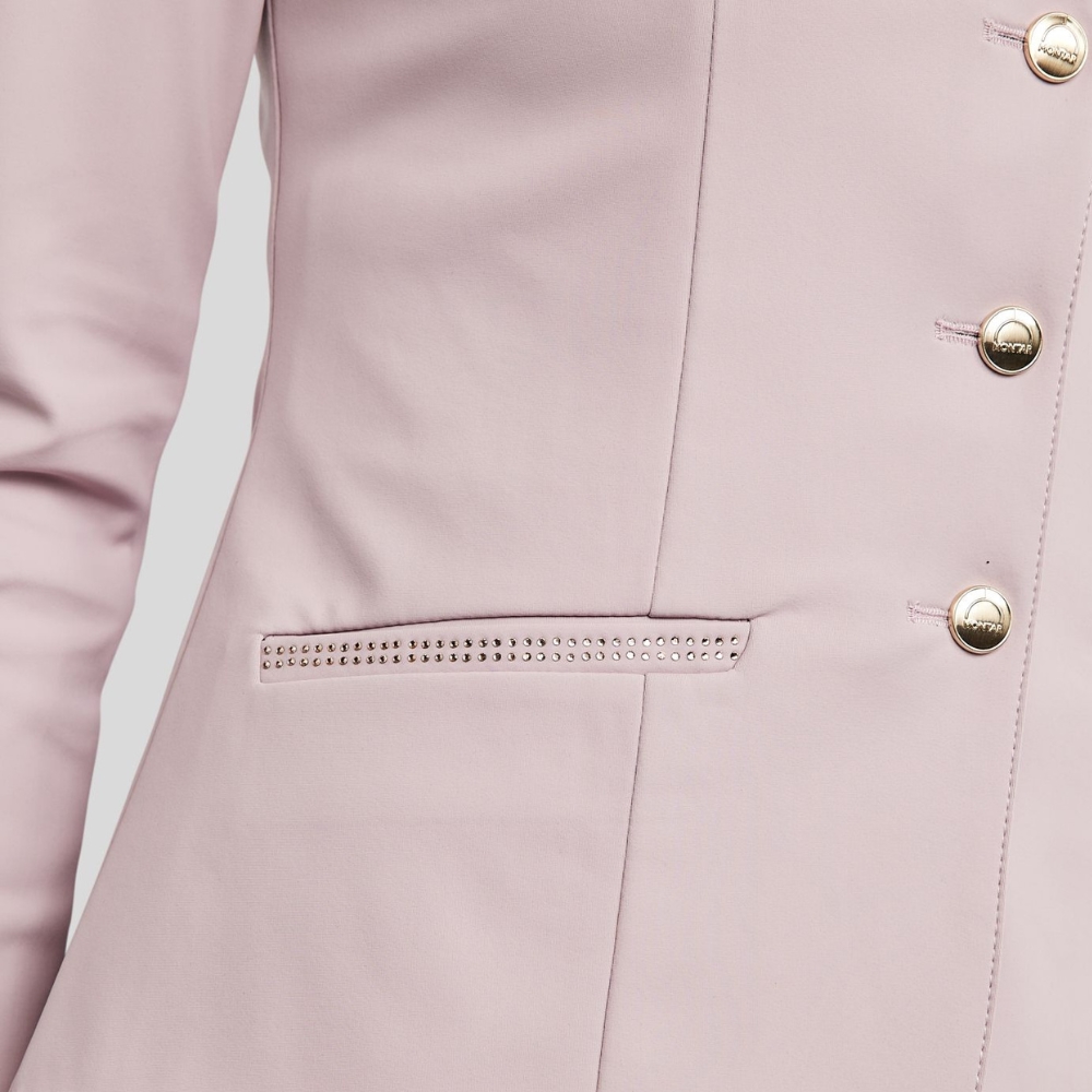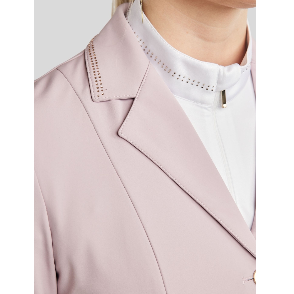 De jas is uitgerust met een verborgen rits onder de knopen, die zorgt voor een optimale pasvorm en een gladde, elegante uitstraling aan de voorkant. De getailleerde en vrouwelijke pasvorm accentueert het silhouet en biedt tegelijkertijd maximaal comfort – ideaal voor wedstrijd- en competitiegebruik.