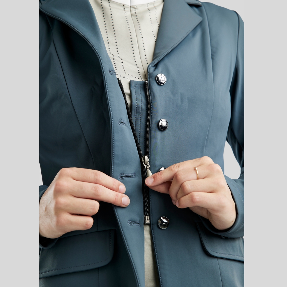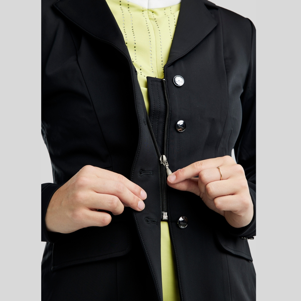 De praktische ritssluiting is verborgen onder de knopen om de jas een goede pasvorm en een professionele uitstraling te geven, terwijl het tegelijkertijd gemakkelijk toegang biedt om de pasvorm aan te passen.