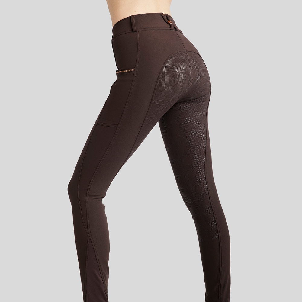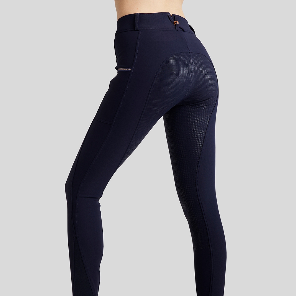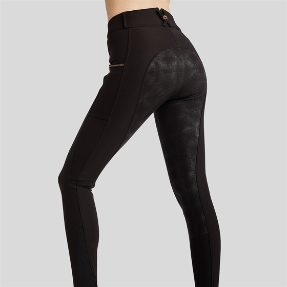 Ontworpen voor ruiters die een elegante uitstraling willen. Met een rosegold logo en kristallen krijg je een prachtige en luxueuze look. De broek is gemaakt van rekbaar en ademend materiaal dat je het beste comfort biedt en je droog houdt. De broek heeft bovendien een veilige zak voor je telefoon, wat praktische functionaliteit met elegantie combineert.