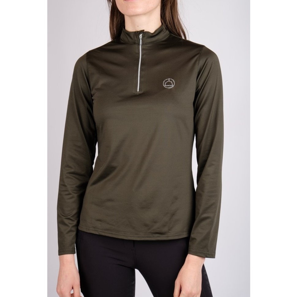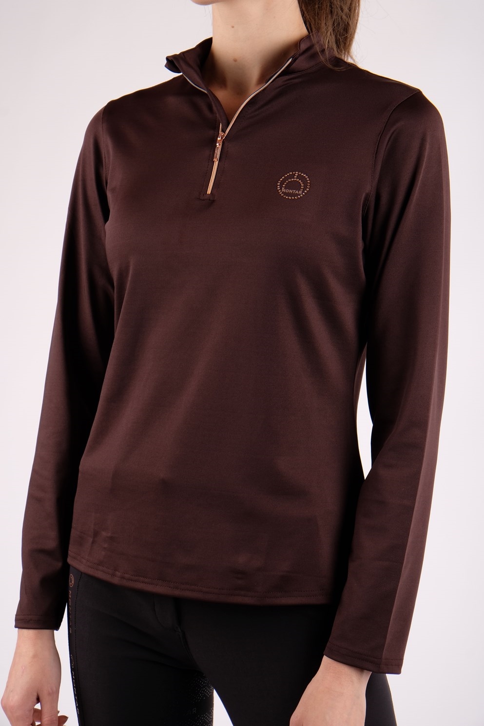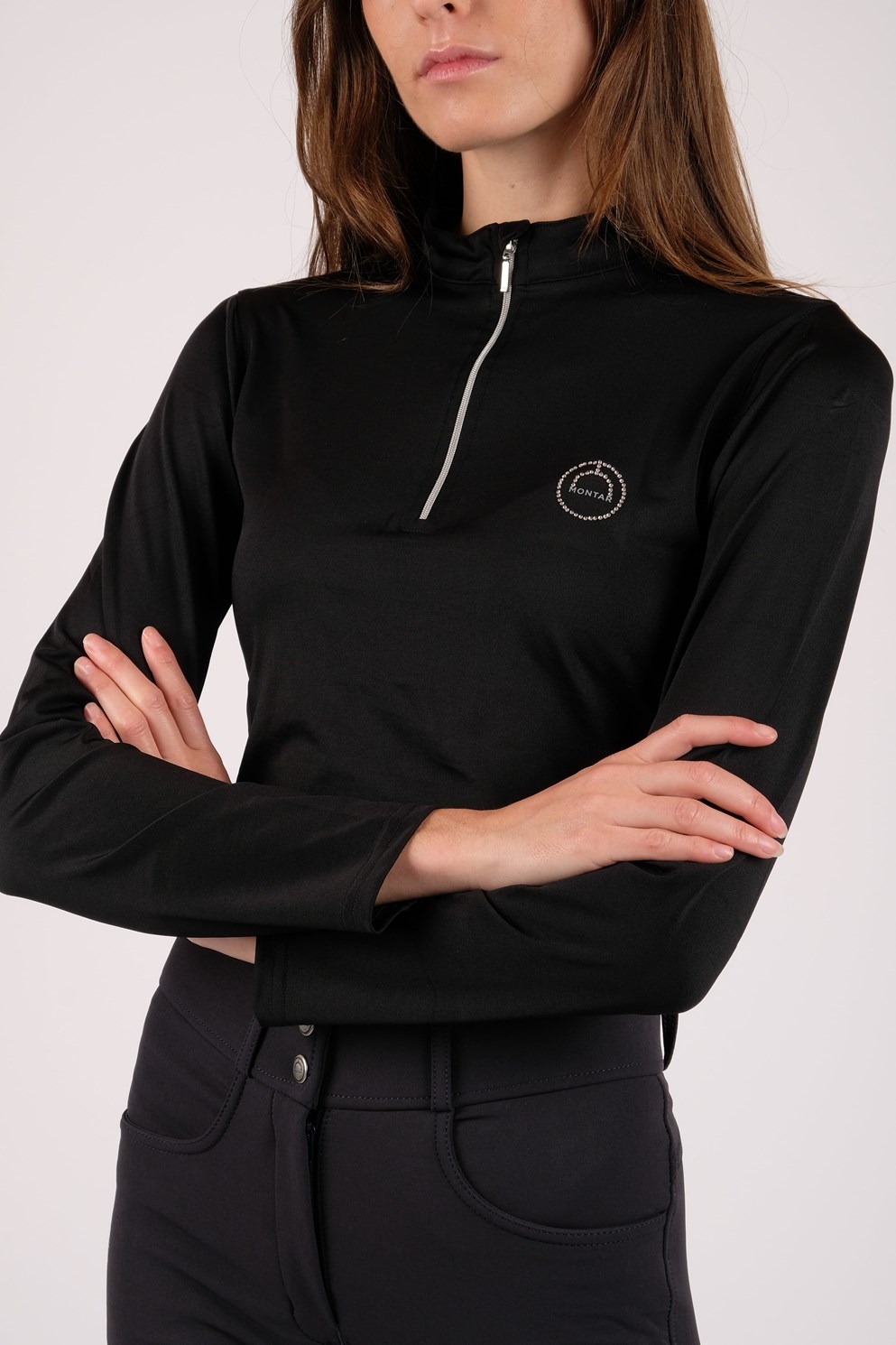 Het shirt heeft een zilveren rits bij de kraag en aan de linkerkant is er een mooi Montar kristallen logo.