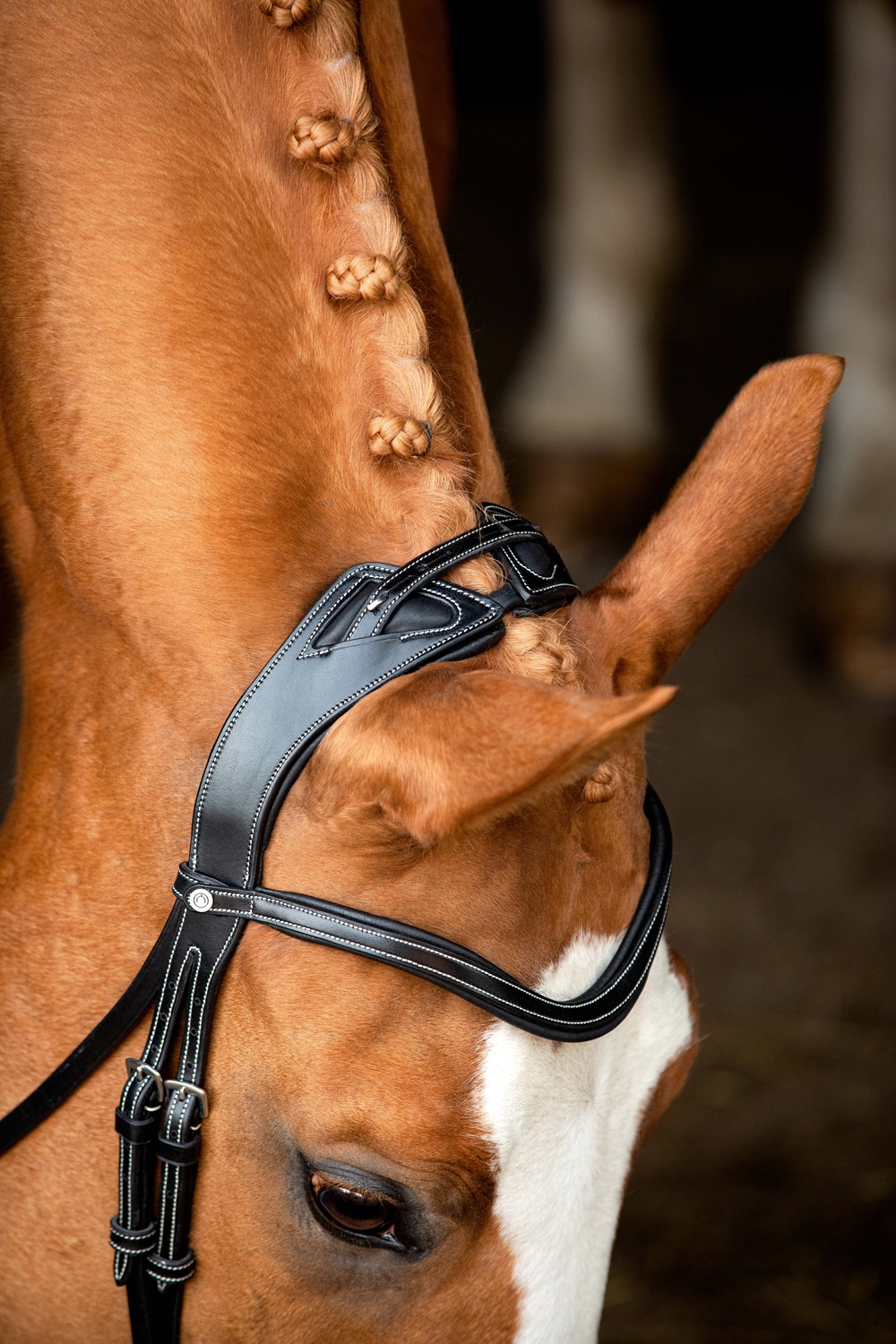 Nieuw en innovatief ergonomisch hoofdstel in ECO Sedgewick leer met roestvrijstalen gespen.