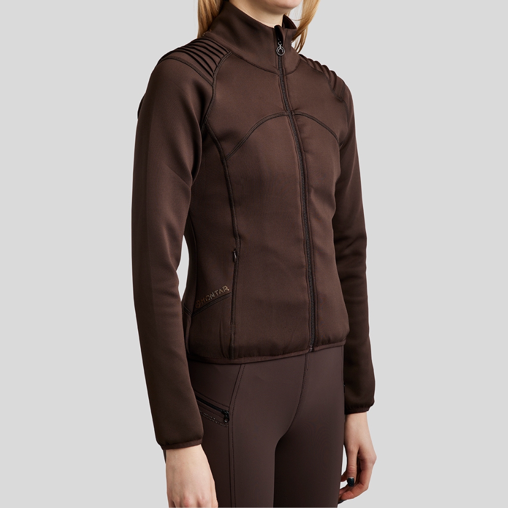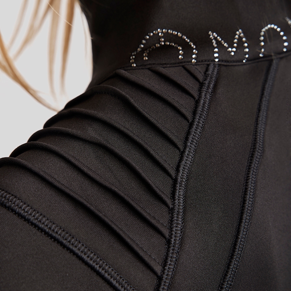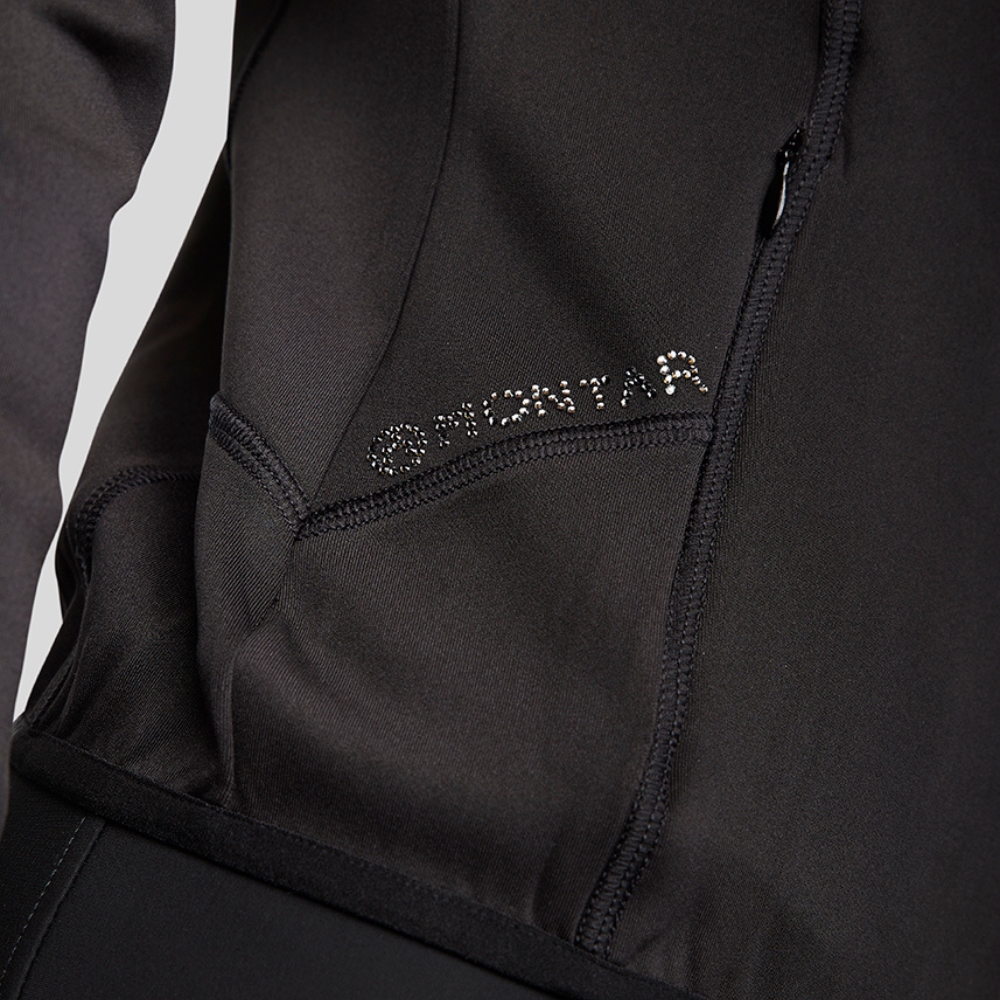 Deze softshell-jas combineert comfort, stijl en prestaties en is ontworpen voor ruiters die zowel functionaliteit als elegantie wensen. Pintuck-details op de schouders creëren een slanke en verfijnde uitstraling, en de fonkelende kristallen op de achterkant van de kraag voegen een vleugje glamour toe.