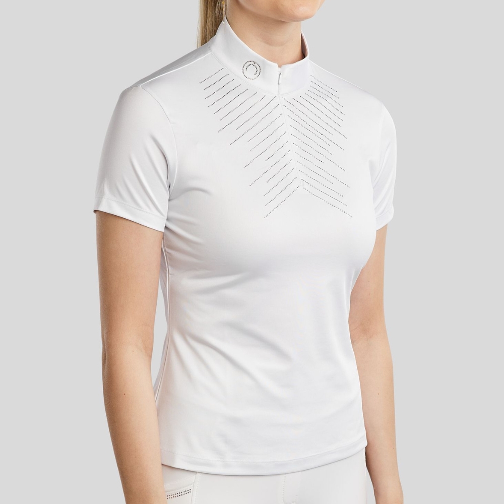 Voeg een stralende en elegante touch toe aan je wedstrijdgarderobe met de Montar MoSparkle wedstrijdblouse. Deze vrouwelijke en stijlvolle blouse combineert een klassieke look met luxe kristaldetails en hoog comfort – perfect voor de ruiter die een exclusieve uitstraling in de wedstrijdring wil.