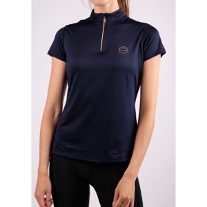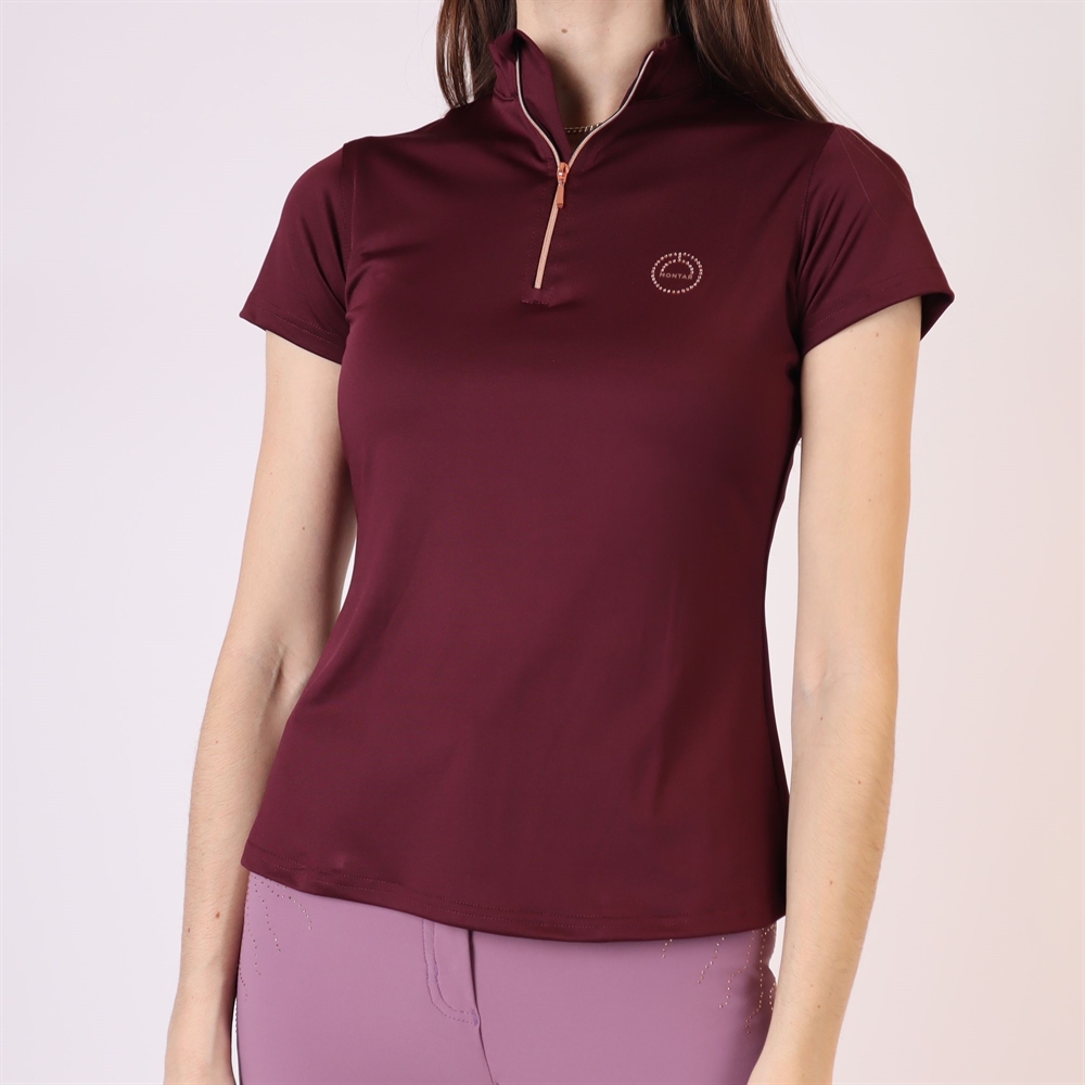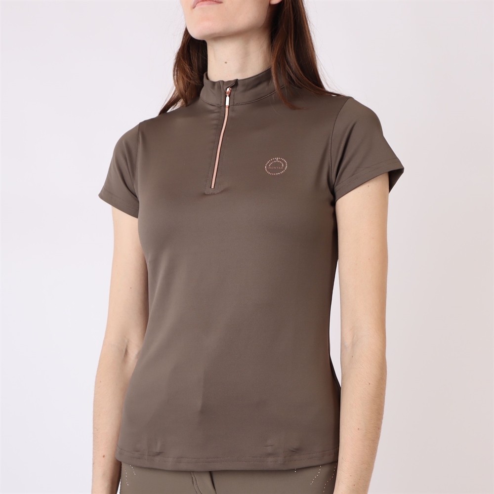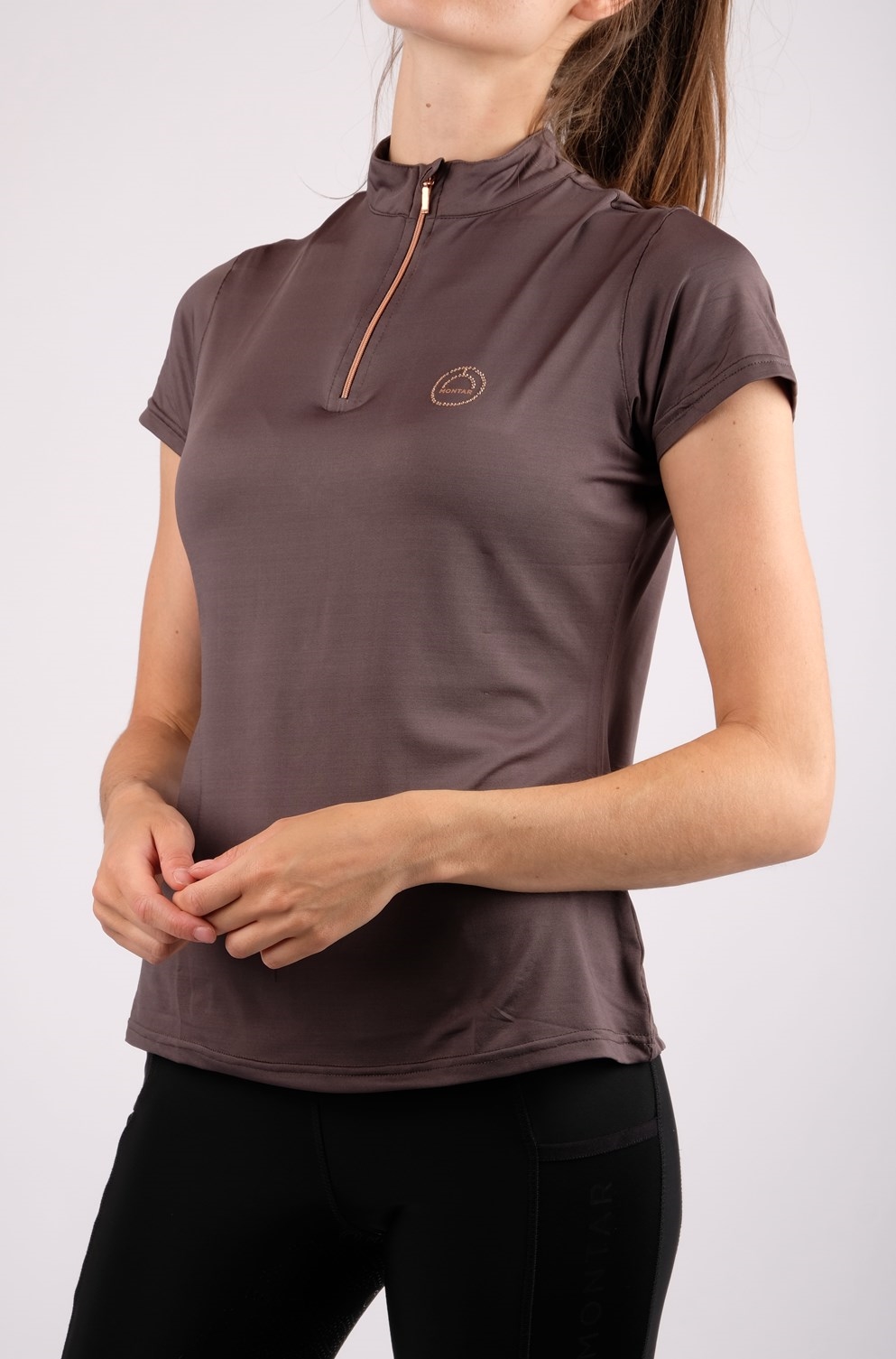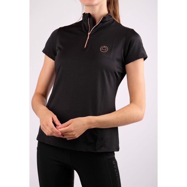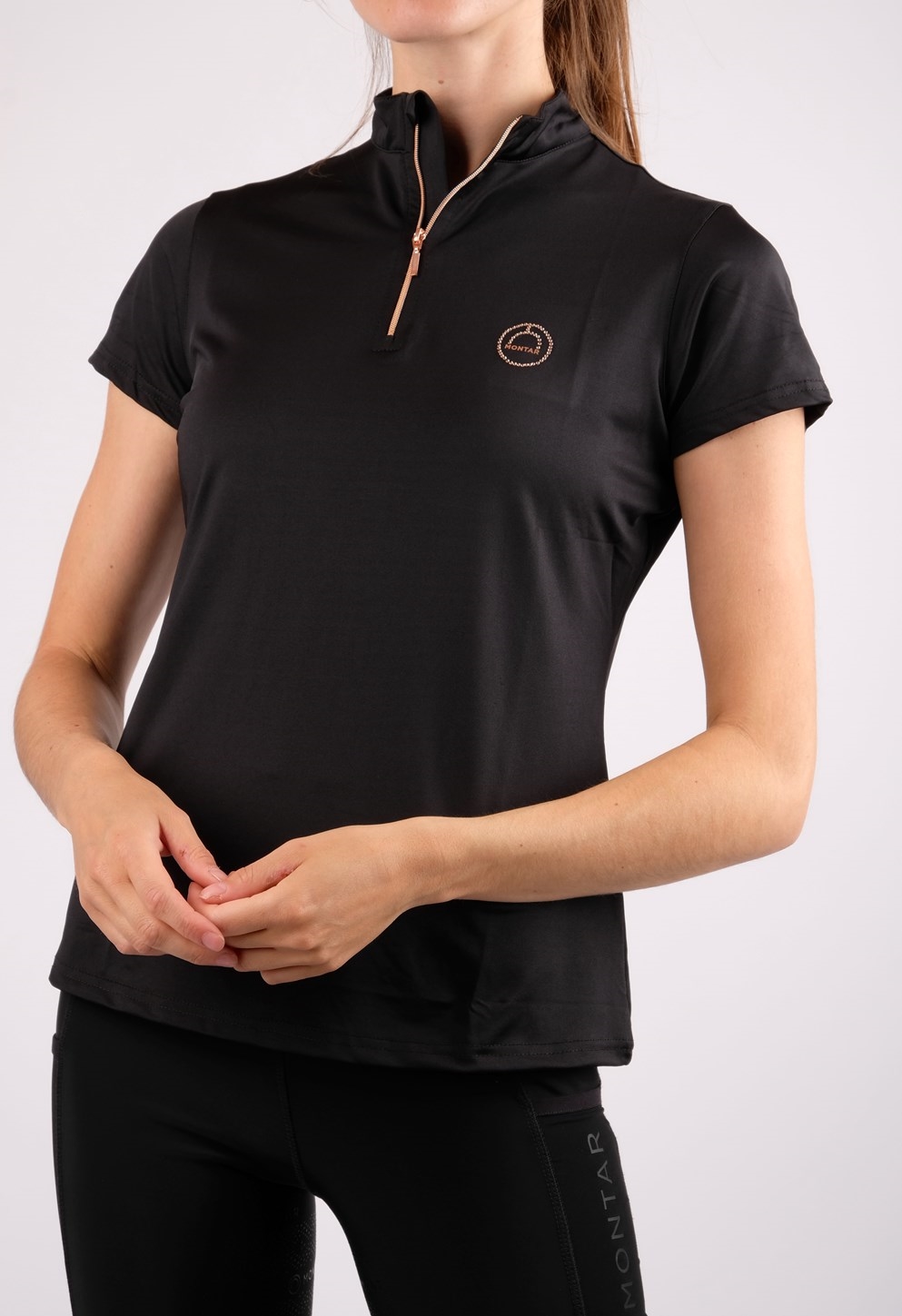 Everly rosegold polo is een klassieke polo met korte mouwen en fijne rosegold details in Mon-Tech stof. Mon-Tech is uiterst rekbaar, ademend en zweetabsorberend. Mon-Tech is speciaal ontwikkeld voor sportgebruik en heeft een fantastische pasvorm. De Everly polo heeft een lage opstaande kraag. Aan de voorkant is er een rits in rosegold en aan de linkerkant is er een Montar kristal logo versierd met glinsterende rosegold stenen. Combineer de Everly rosegold polo met onze Molly rijbroek met rosegold details voor een compleet en exclusieve look.