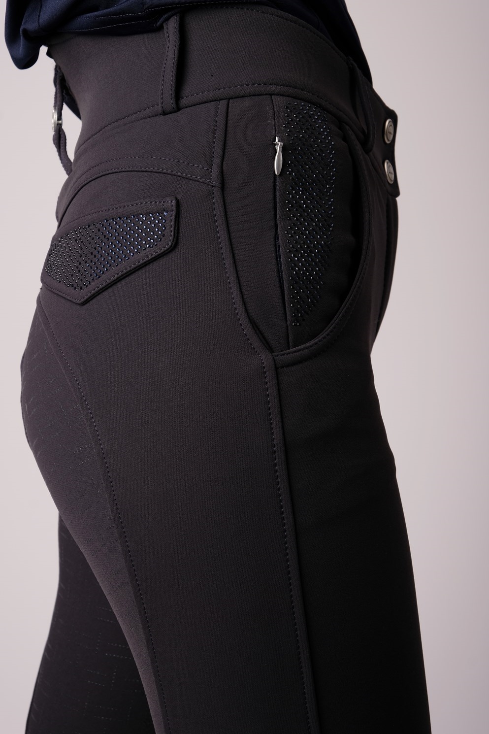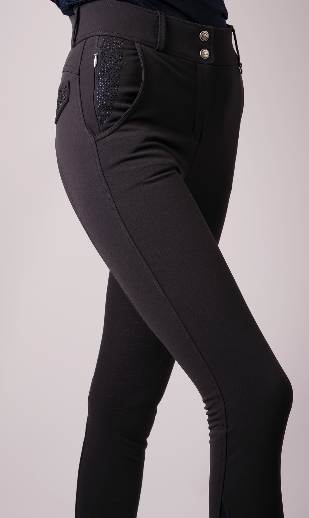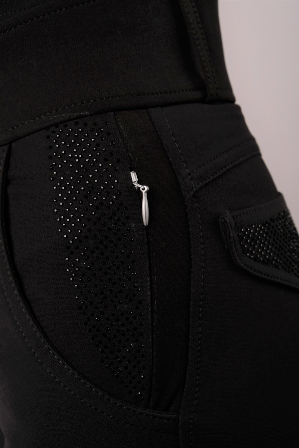 De rijbroeken hebben twee kleine ritszakken aan de voorkant en twee nepzakken aan de achterkant die zijn versierd met prachtige glinsterende stenen.