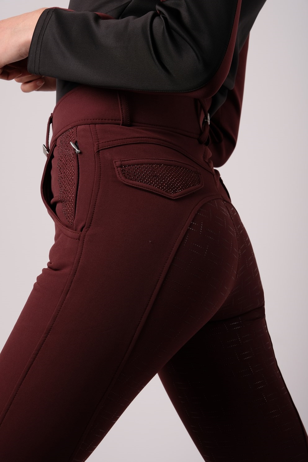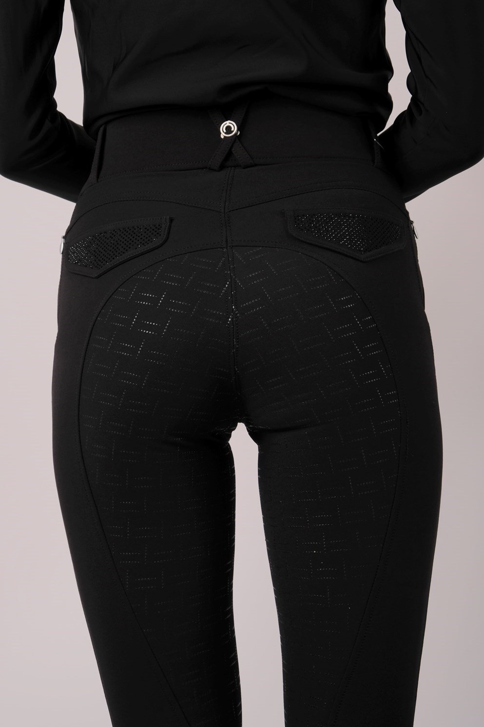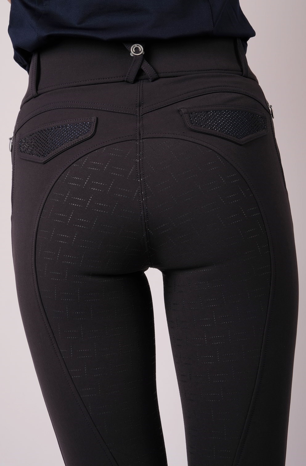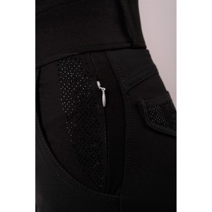 De rijbroeken hebben twee kleine ritszakken aan de voorkant en twee nepzakken aan de achterkant die zijn versierd met prachtige glinsterende stenen.