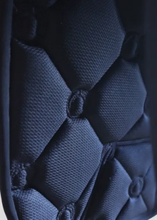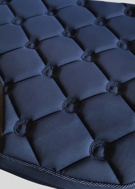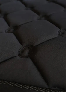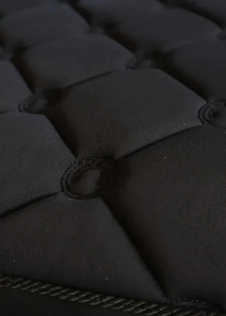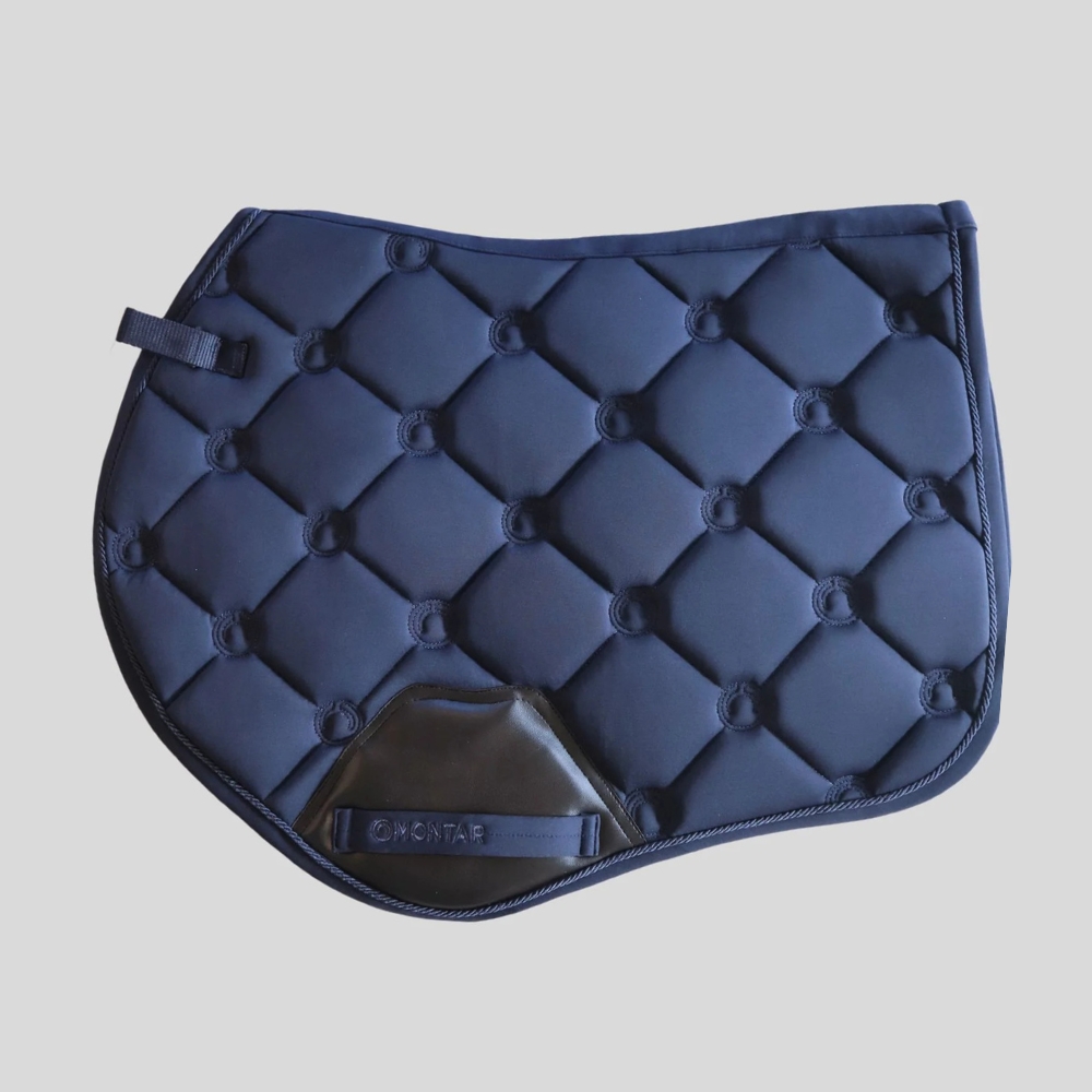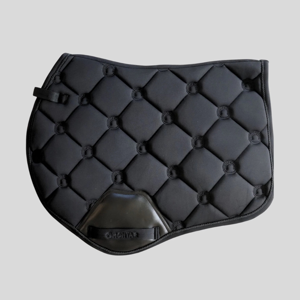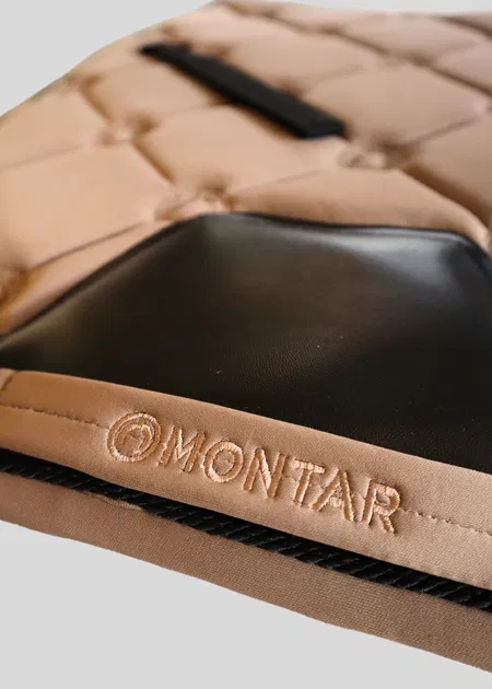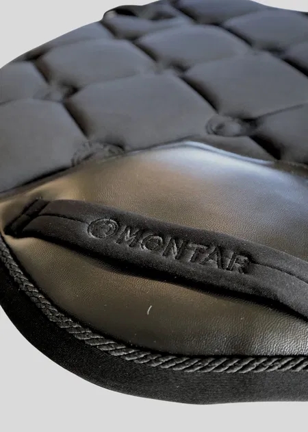 De onderlegger is gemaakt van zacht softshell-materiaal met diamantstiksel en heeft een achterkant met zweetabsorberend mesh, zodat je paard droog en comfortabel blijft. De springonderlegger heeft een singelbeschermend gebied van imitatieleer met het Montar-logo, dat zowel duurzaam als gemakkelijk schoon te maken is.