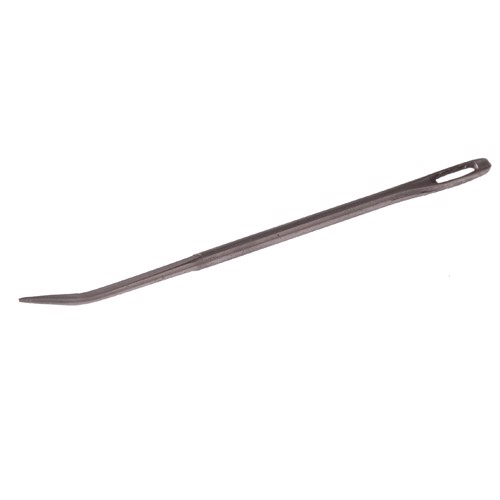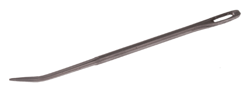 Naald met gebogen uiteinde, geschikt voor het vastnaaien van vlechten. De naald is 10 cm lang.