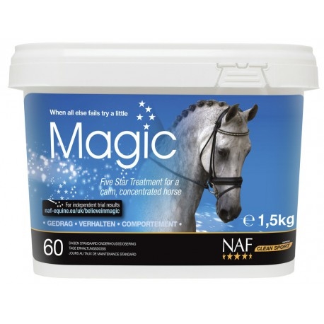 NAF Magic Powder is een kalmerend supplement voor paarden en pony's, gebaseerd op magnesium en een unieke mix van kalmerende kruiden en voedingsstoffen. Het product is ontworpen om spierweefsel te ontspannen, concentratie te ondersteunen en een rustig, ontspannen paard te bevorderen tijdens training, transport of wedstrijden.