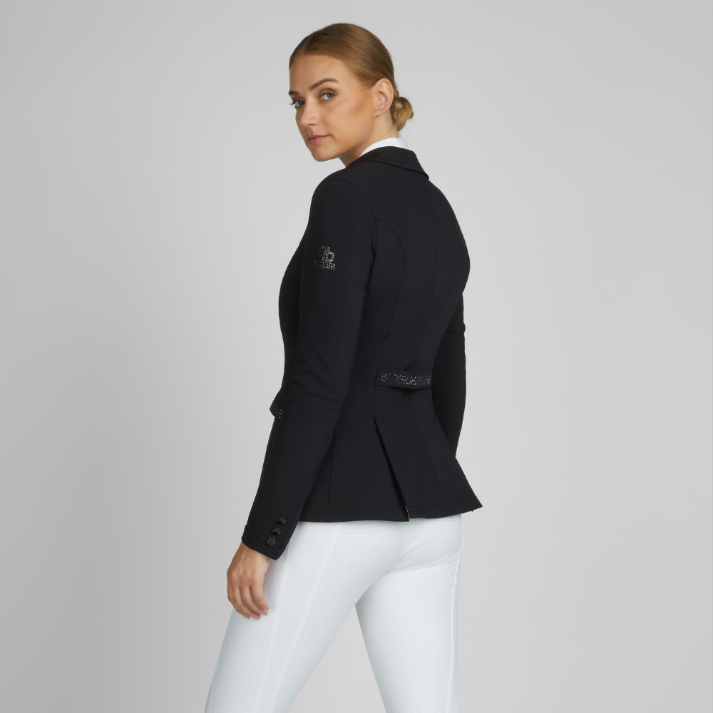 Mooie dames wedstrijdjas met glinsterende strass details. De wedstrijdjas is gemaakt van functionele ademende Tech-Jersey stof, met mesh voering. Tailleband aan de achterkant en zakken aan de voorkant zijn mooi versierd met strass.