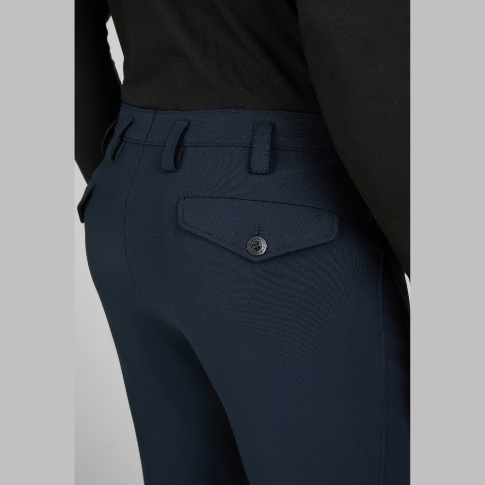 Rodrigo heeft 2 schuine zakken en 2 nepachterzakken en riemlussen. Elastisch lycra bij de enkel zodat ze bij elke beenbreedte passen en de rijbroek comfortabel in rijlaarzen zit.