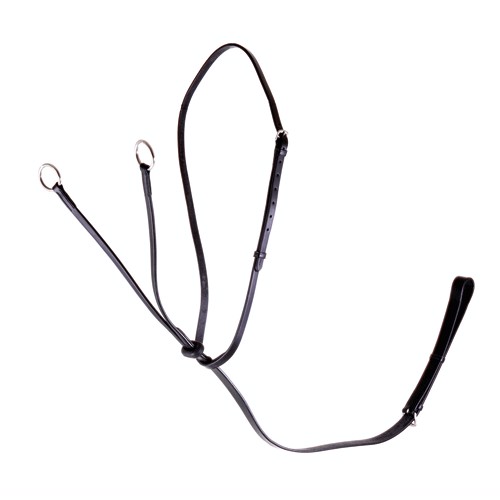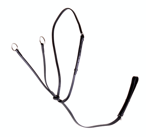 Lederen martingaal met rubberen stopper en verstelbare halsriem en singelriem. Roestvrijstalen gespen.
