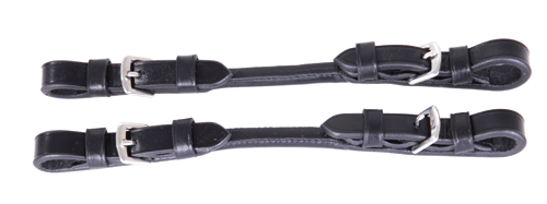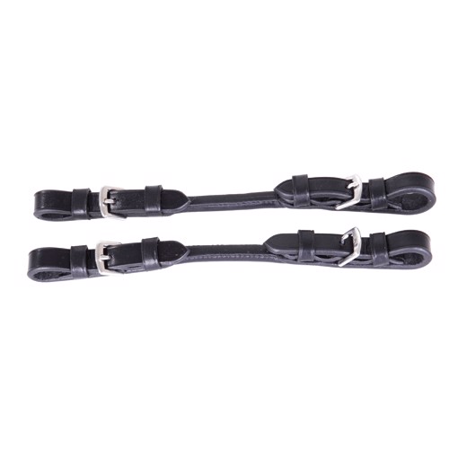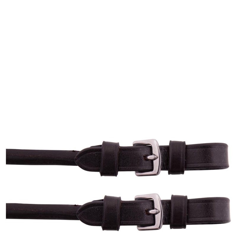Pelham riemen gemaakt van rondgenaaid leer met gespen van roestvrij staal.