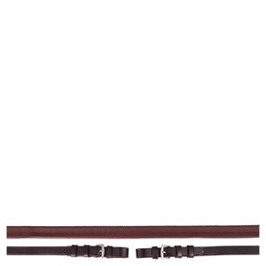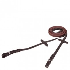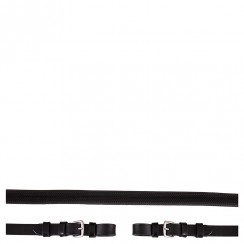 De teugel is uitgerust met rubber, wat helpt bij correcte handplaatsing, evenals lederen uiteinden met gespen van roestvrij staal, die een veilige en betrouwbare bevestiging aan het hoofdstel bieden. De teugel heeft dezelfde breedte in zowel grip als lederen uiteinden en is geschikt voor zowel pony als paard.