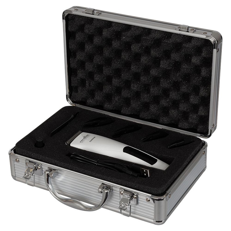 De tondeuse wordt geleverd in een praktische aluminium koffer inclusief olie en reinigingsborstel.