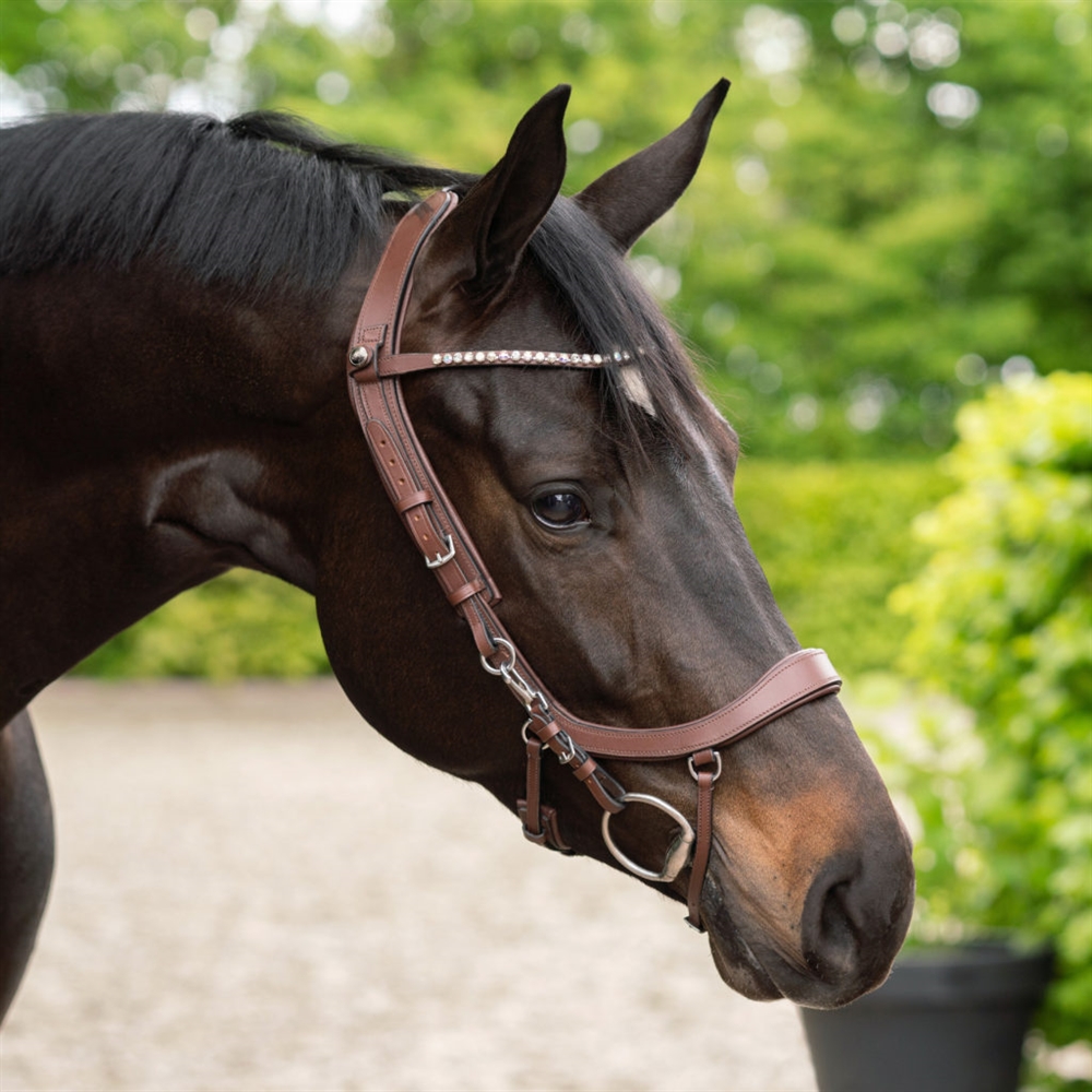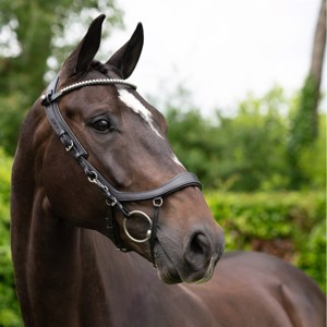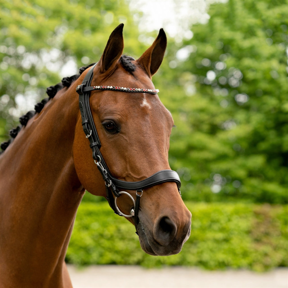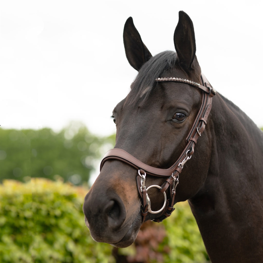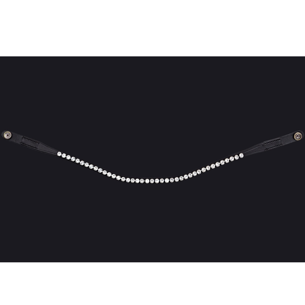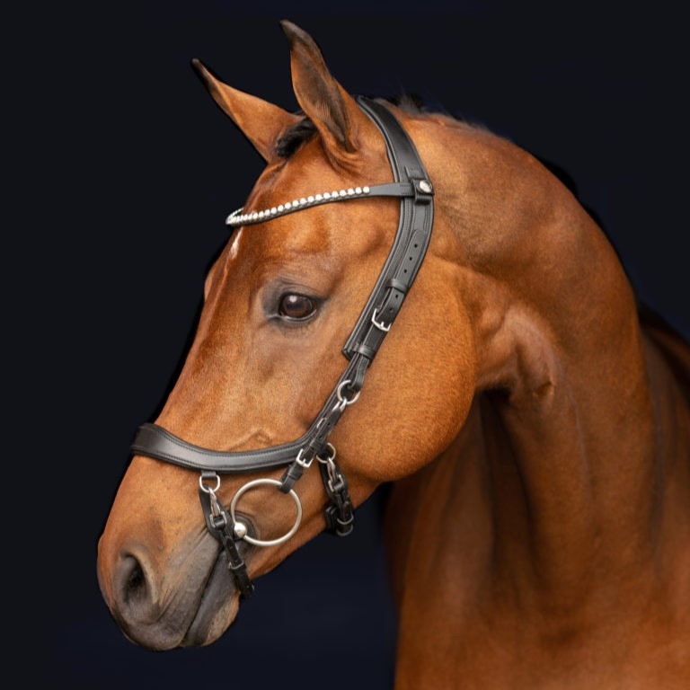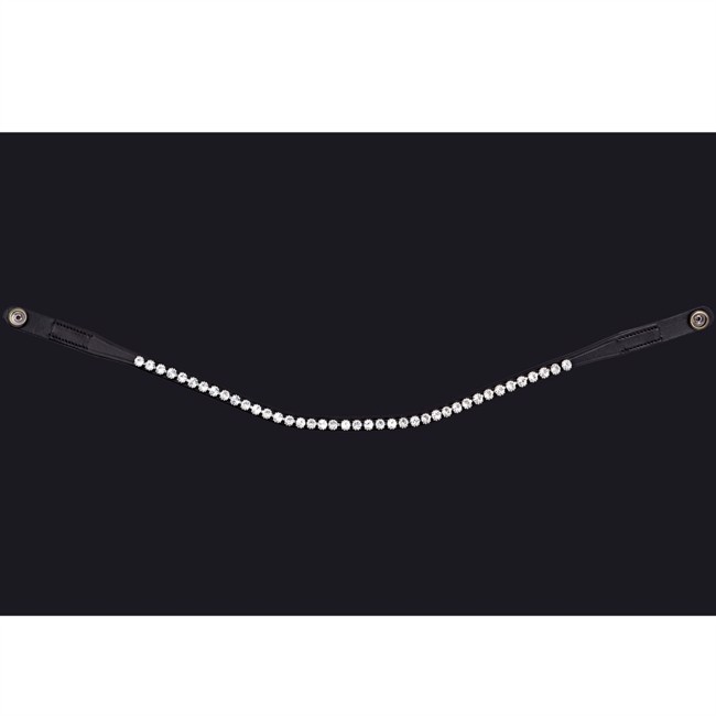 PRESTEQ ShineBright frontriem is speciaal ontworpen voor PRESTEQ-hoofdstellen en maakt het eenvoudig om frontriemen te verwisselen dankzij het slimme drukknoop systeem. De frontriem is elegant gebogen en versierd met glinsterende Swarovski-kristallen, die een stijlvolle en opvallende uitstraling geven in de wedstrijdring.