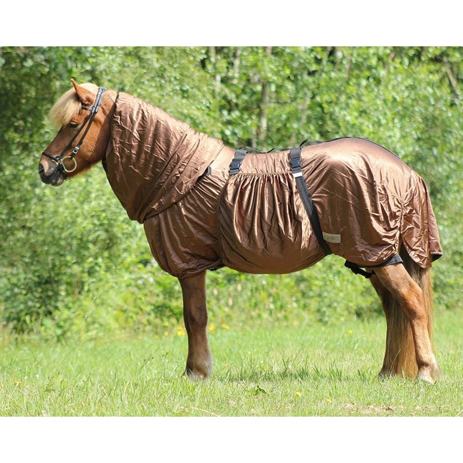 Het eczeemdeken beschermt het paard tegen insectenbeten en knutten, die een allergische reactie en hevige jeuk kunnen veroorzaken bij sommige paarden. Het eczeemdeken heeft een sluiting tussen de voorbenen om de brede buikflap vast te maken, evenals elastische verstelbare beenriemen en een brede staartflap. Het eczeemdeken beschermt het paard tegen zonlicht en UV-stralen. Bovendien is het eczeemdeken gemaakt van ademende stof, die tegelijkertijd elastisch is, waardoor het strak tegen het lichaam kan zitten en zo veel mogelijk bescherming biedt. Er is lycra bij het schoft om de druk te verminderen. Het deken is gemaakt van 100% polyester.