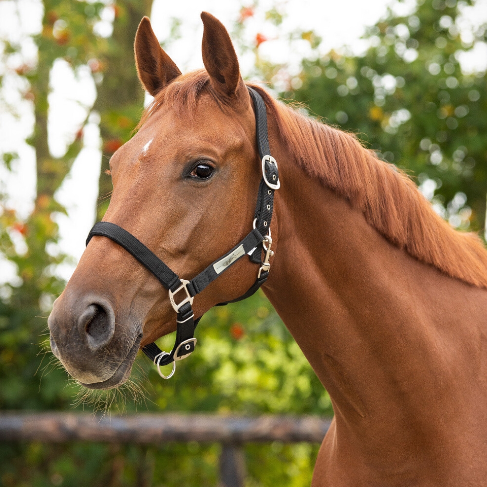 Het halster kan zowel bij de neus- als nekriem worden versteld.