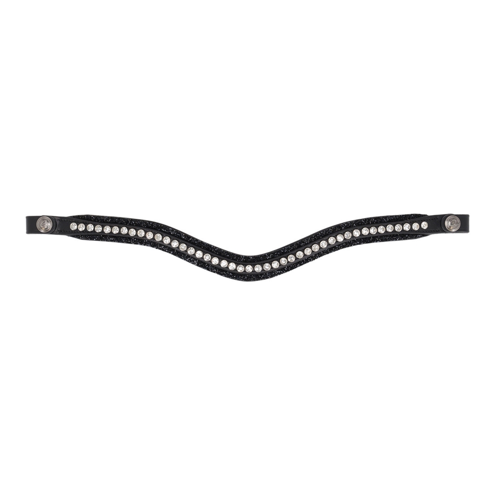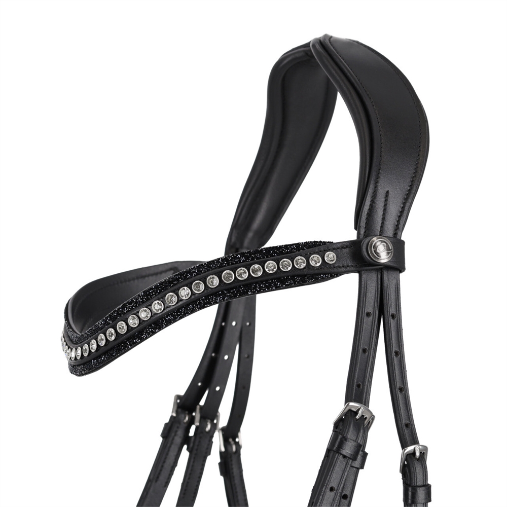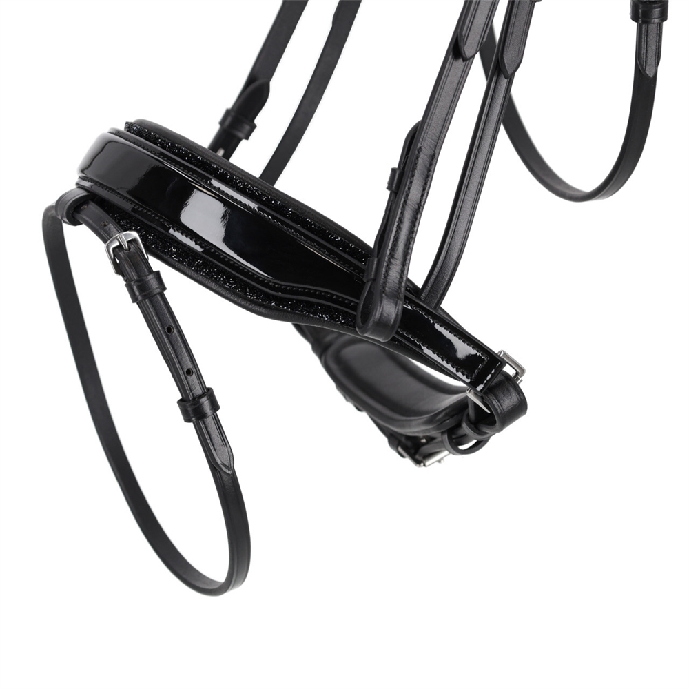 De neusriem is uitgerust met afneembare voering met prachtige lak- en glitterdetails, die eenvoudig kunnen worden verwisseld via klittenbandsluiting. Het decoratieve frontriem met stenen en glitter kan eveneens snel worden verwisseld dankzij praktische drukknoopjes, wat het gemakkelijk maakt om het hoofdstel aan te passen voor zowel dagelijkse training als wedstrijdgebruik.